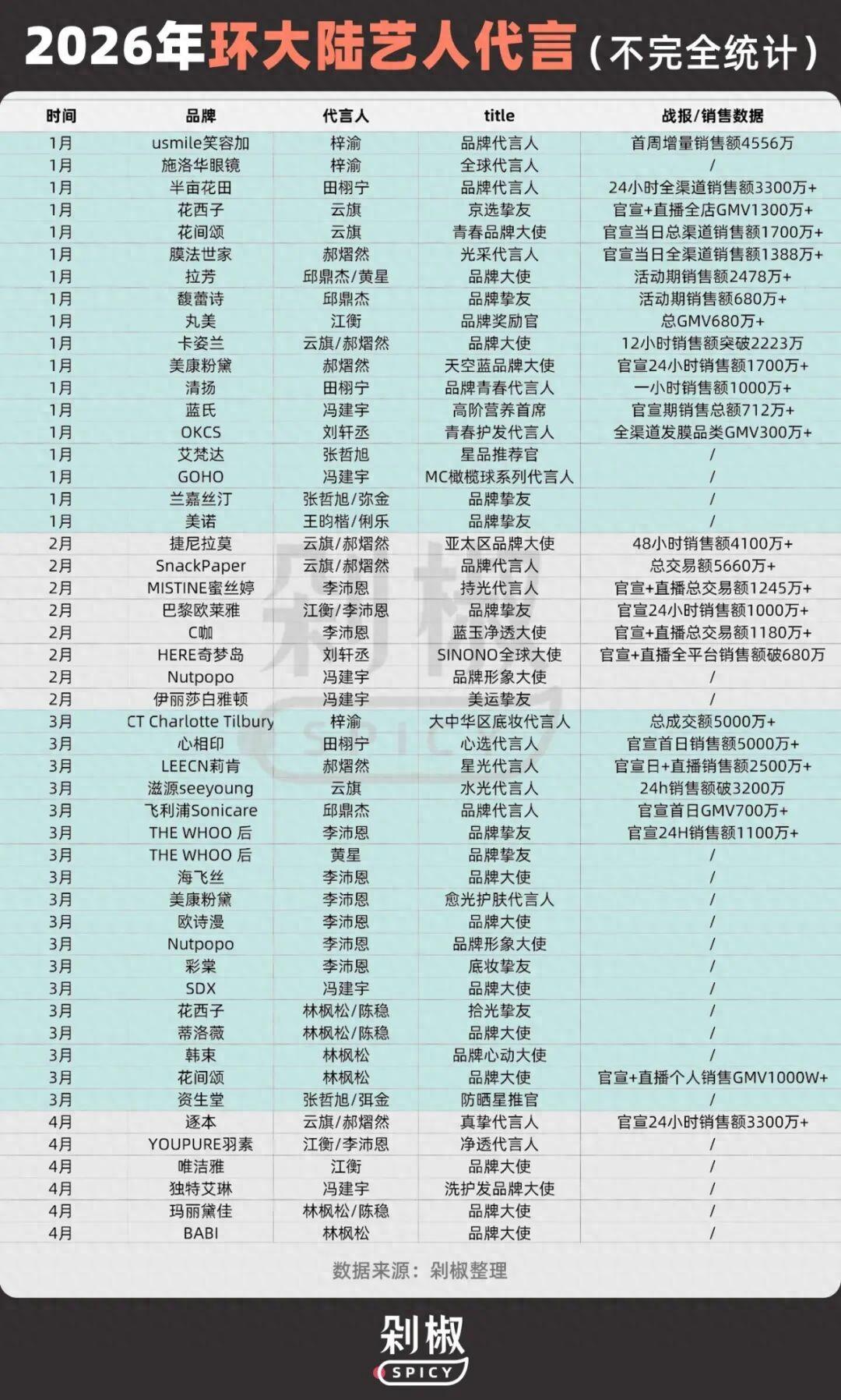 如果用四個字形容2026年第一季度的明星代言市場,火中取栗一定是關鍵詞。據剁椒Spicy不完全統計,超過415個品牌代言合作中,有43起代言合作落入環大陸耽美劇男藝人手中。