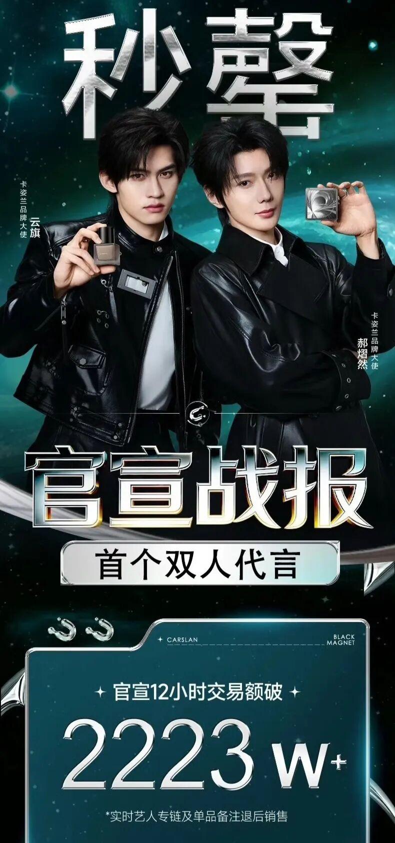 同爲環大陸耽美劇演員的雲旗、郝熠然顯然更符合低調策略,也具備更高性價比。剁椒瞭解到,《吾岸》的兩位主演雲旗、郝熠然是環大陸藝人中運營思路最清晰的一批。兩人簽約在同家經紀公司和光傳媒,在推動雙人代言上更爲便利。與頂流動輒上千萬的代言費相比,雲旗、郝熠然的首個短期商務合作報價均不超過200萬,但轉化效率動輒千萬。