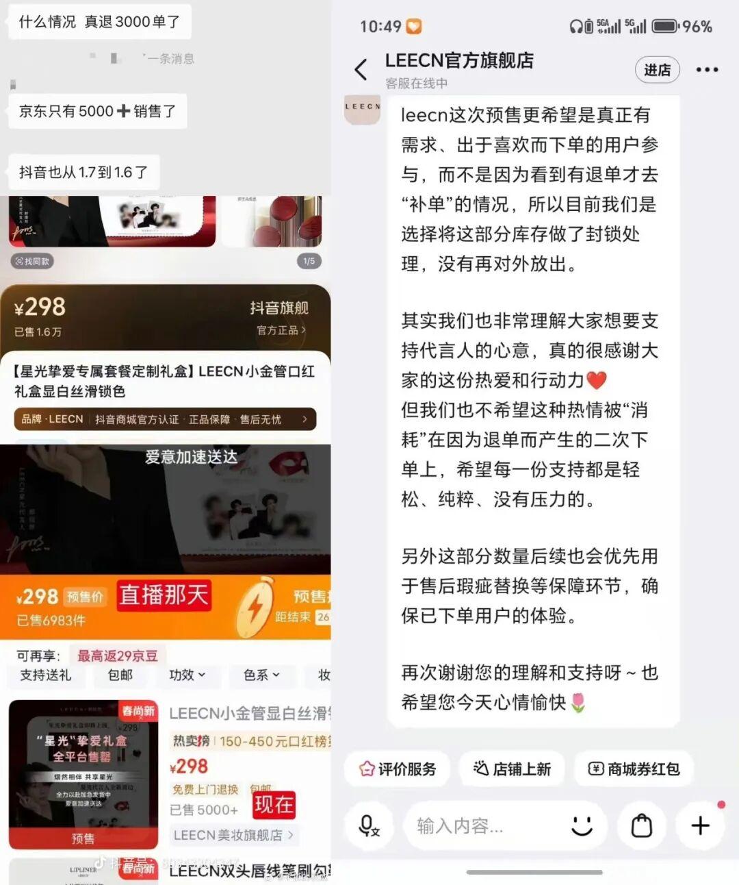 3月時,LEECN莉肯與郝熠然的合作中,便由於粉羣爭執,出現了異常的粉絲先下單再批量退款的情況,數千單的退款甚至讓品牌方不得不緊急封鎖庫存,避免爭議進一步擴大。