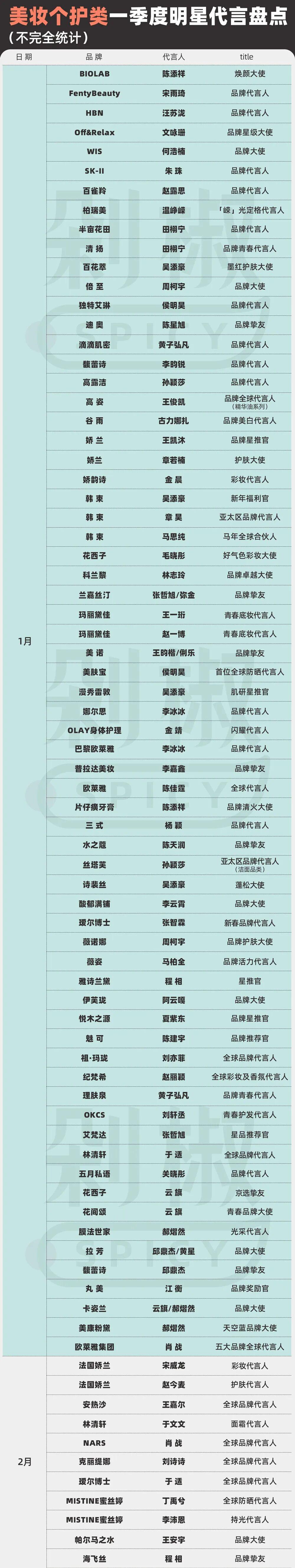 美妝個護行業一季度官宣的超過160起代言案例中,爲了規避風險,品牌們在短代title設置上花樣百出,從全球代言人到品牌大使、品牌摯友、青春代言人、新年福利官……個頂個的新面孔。