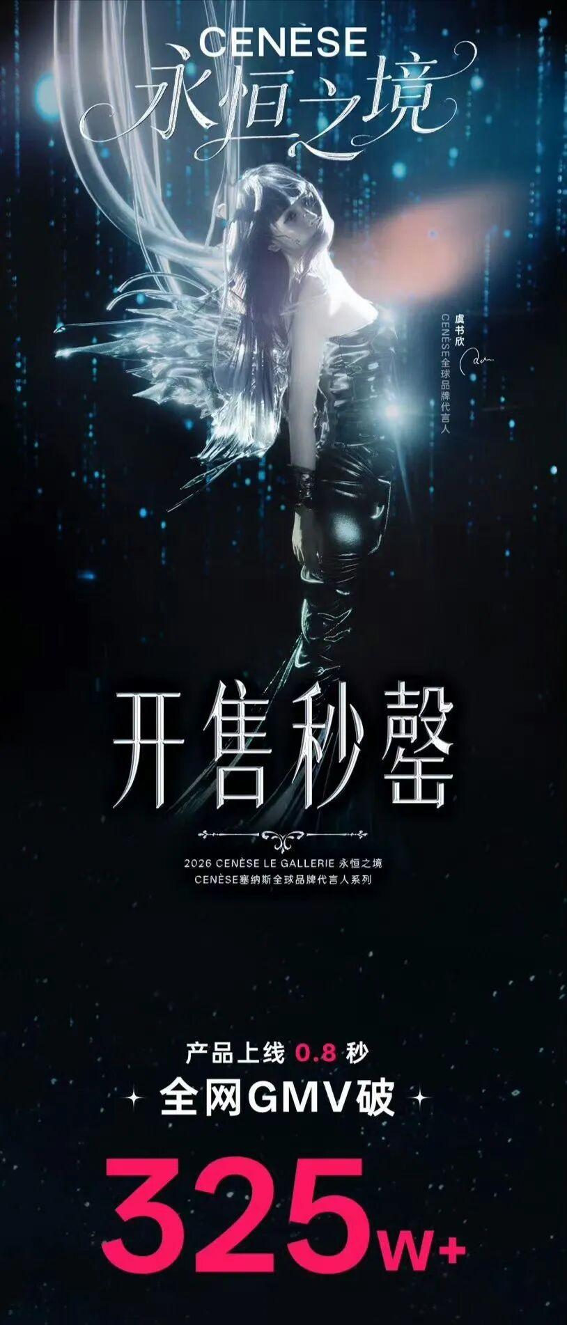 今年3月,虞書欣成爲主打高端收藏的新品牌塞納斯的全球代言人,其聯名系列上線不到1秒便被一搶而空,GMV突破325萬。
