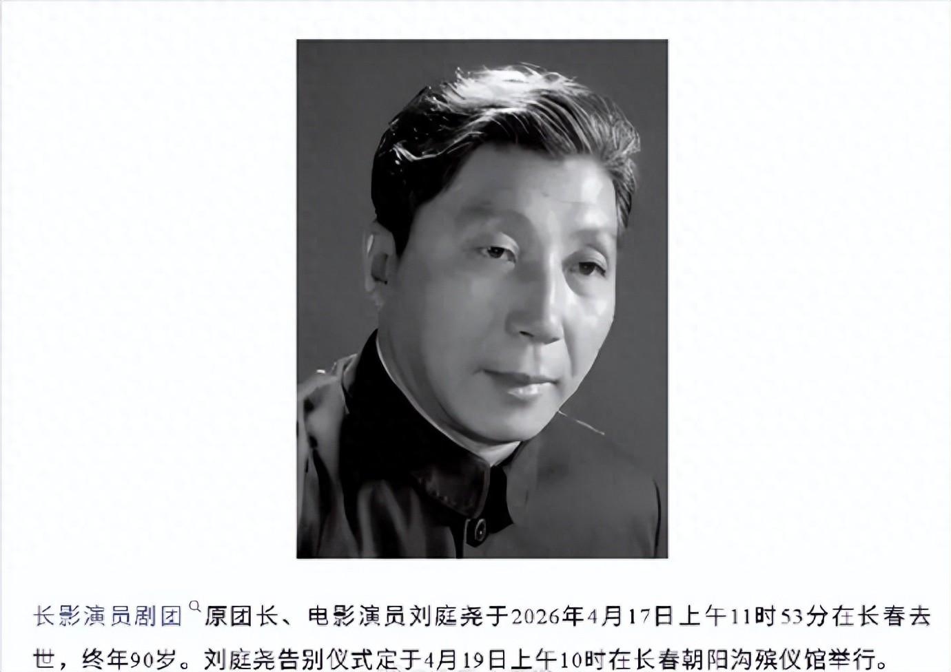長影演員劇團原團長、電影演員劉庭堯於2026年4月17日上午11時53分在長春去世,終年90歲。劉庭堯告別儀式定於4月19日上午10時在長春朝陽溝殯儀館舉行。