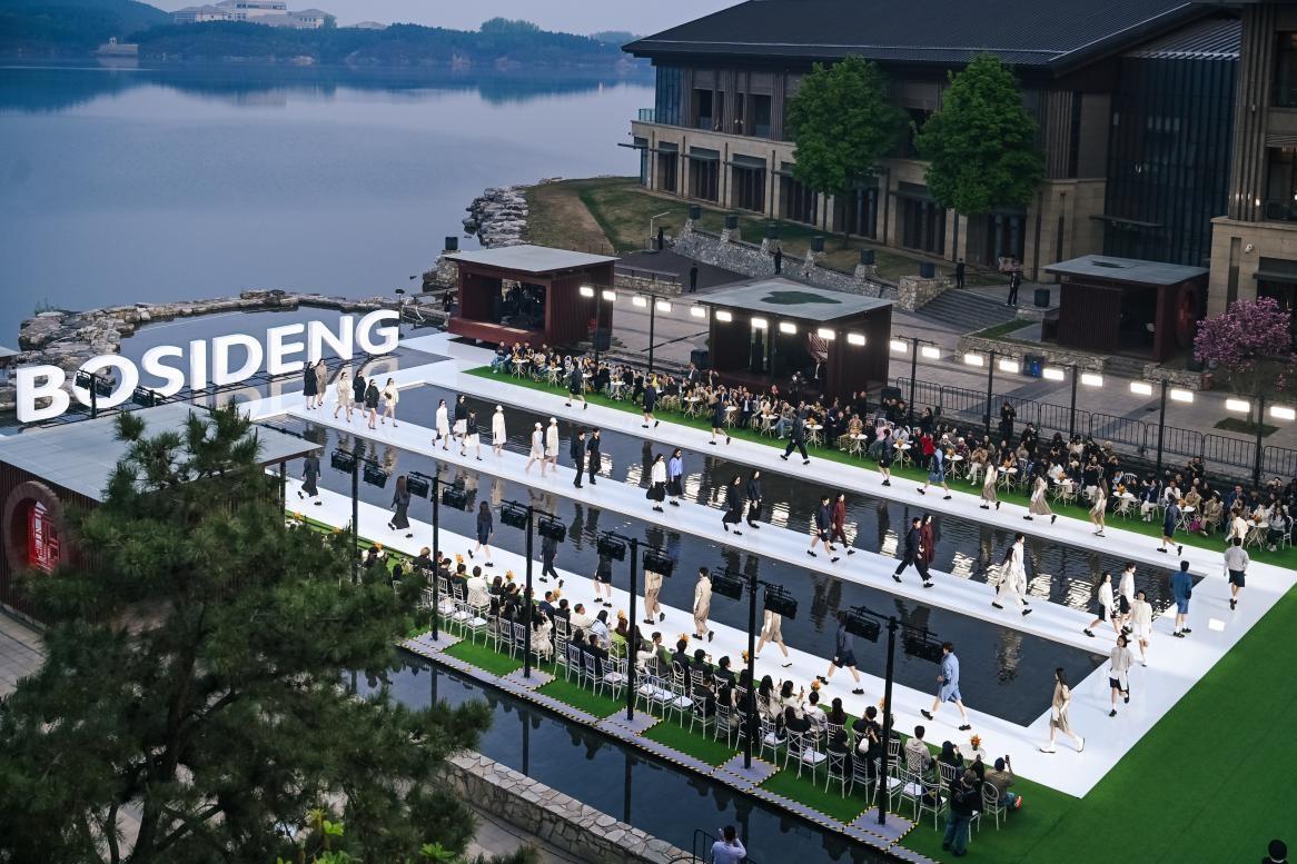 大秀選址雁棲湖畔,湖面波光、遠山肌理、落日餘暉與舞臺背景渾然天成,將波司登本季產品“都市與戶外無界切換”的理念化爲沉浸式的感官體驗。