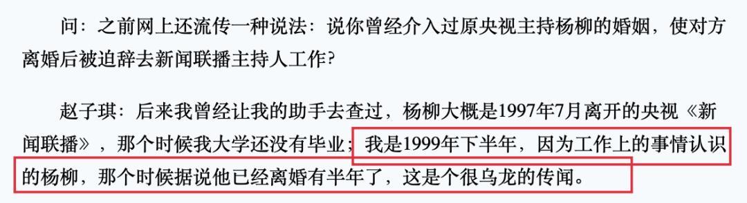 趙子琪沒有否認過這段感情,但也堅決否認自己是插足者,她說自己認識楊柳的時候,對方自稱離婚半年,
