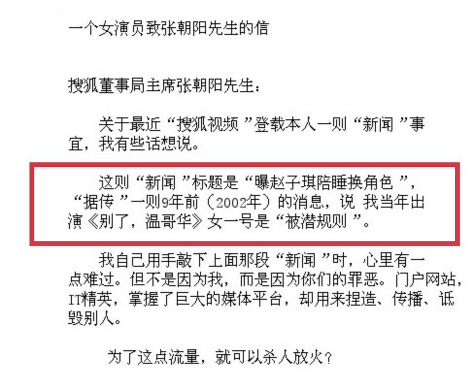 把趙子琪惹怒了,直接炮轟搜狐,在微博發了一封《一個女演員致張朝陽先生的信》(上面就是節選)