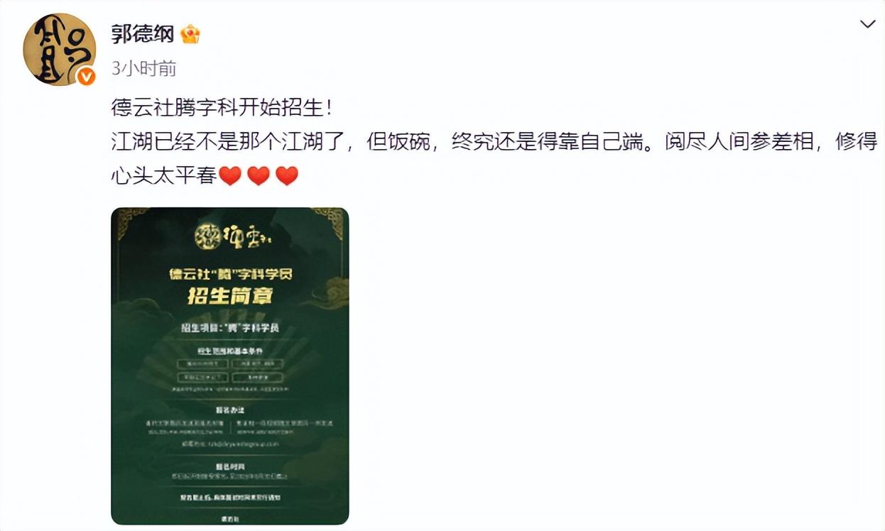 搜狐娛樂訊 19日,郭德綱在社交平臺上發文宣佈德雲社騰字科開始招生,他表示:“江湖已經不是那個江湖了,但飯碗,終究還是得靠自己端。閱盡人間參差相,修得心頭太平春。”據瞭解,德雲社騰字科的招生範圍和基本條件有:年齡25歲以下,身體健康,熱愛曲藝相聲。