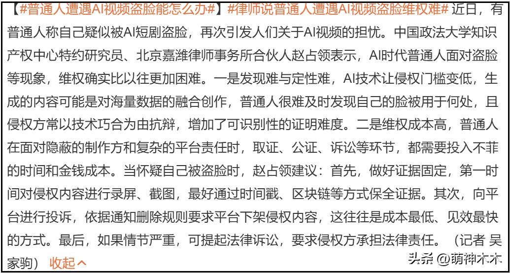 前段時間就有普通人被ai短劇侵權了,ai短劇製作方未經本人同意,把普通人的臉融到反派角色身上,當事人站出來維權,得到的結果僅僅是ai短劇下架,想要後續賠償,只能繼續花精力維權。