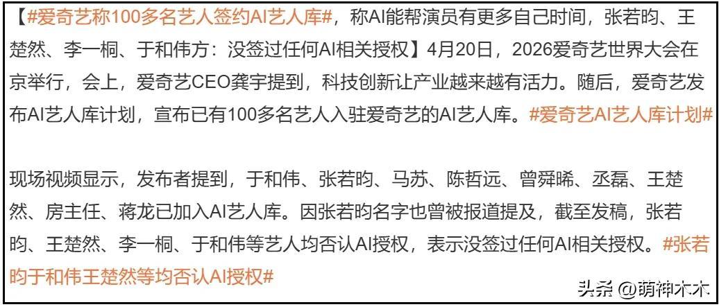 張若昀、王楚然、李一桐、陳哲遠、於和偉等明星都通過工作室或粉絲對接對外強調沒有簽約任何ai影視授權。