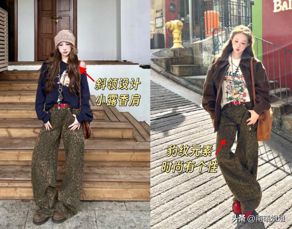 加入豹紋元素的高腰闊腿褲,和寬鬆上衣進行組合的時候,建議可以系根紅色腰帶,勾勒出腰線的同時,又可以突出造型亮點。