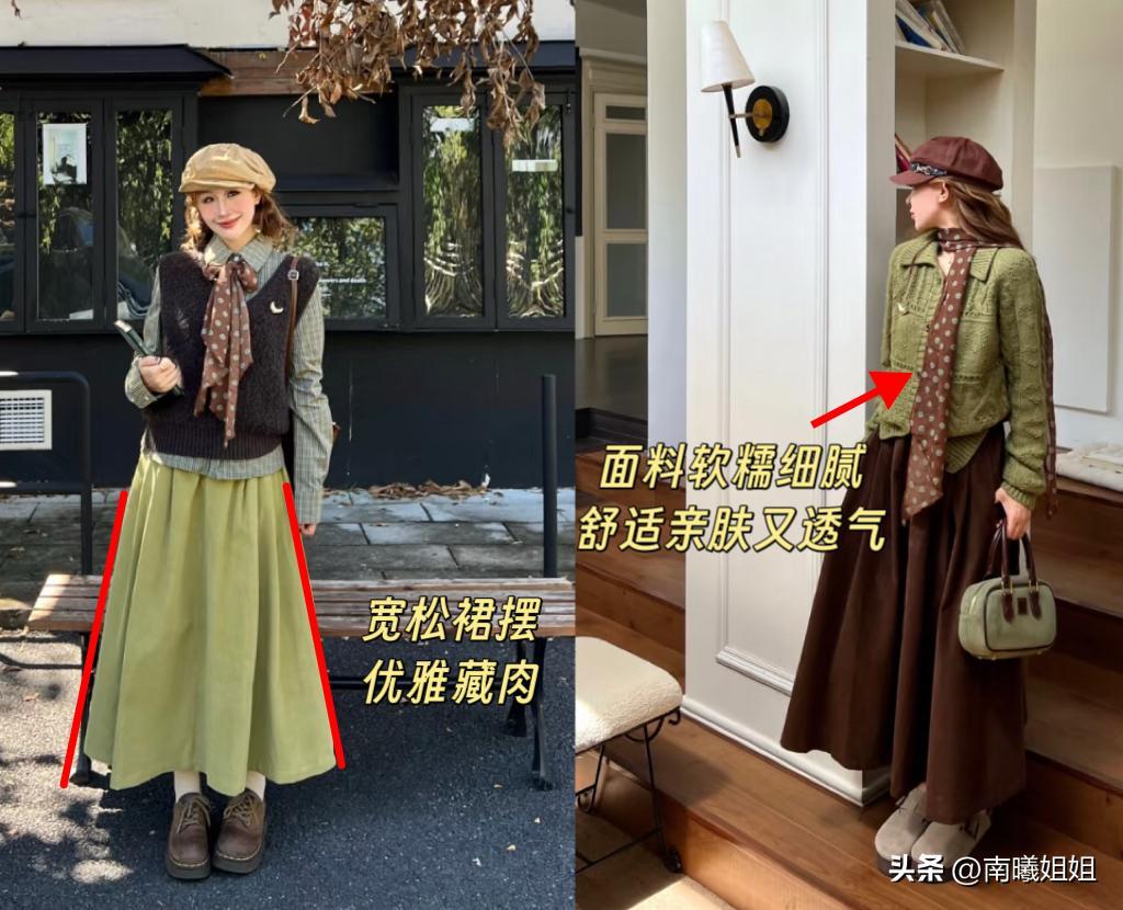 面料柔軟的針織毛衣,單穿疊穿都很好看,下身配條闊版設計的半身傘裙,整體採用“綠色+棕色”的公式,生命力十足!