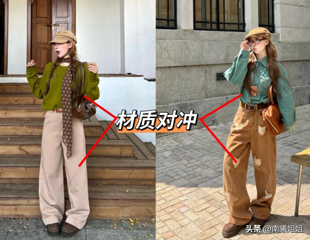 秋天想要穿出氛圍感,光是用好棕色,遠遠不夠,一組完美的穿搭,往往離不開材質之間的碰撞,尤其是上衣下褲的搭配,可以採用毛呢、皮革、棉綢、羊絨互相碰撞。