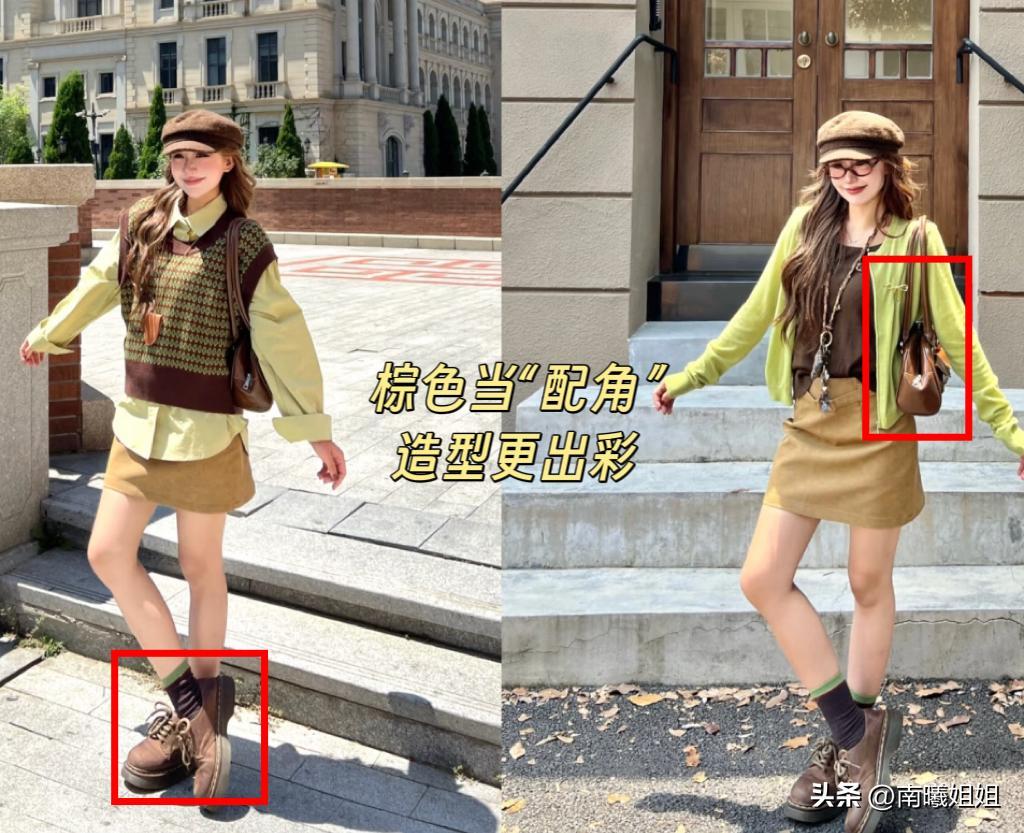 無論是一身棕色系的穿搭,或者是棕色和彩色的組合,其實我們在進行搭配的時候,最需要關注的就是層次感,即便是大面積的棕色覆蓋,也要考慮到深淺關係。