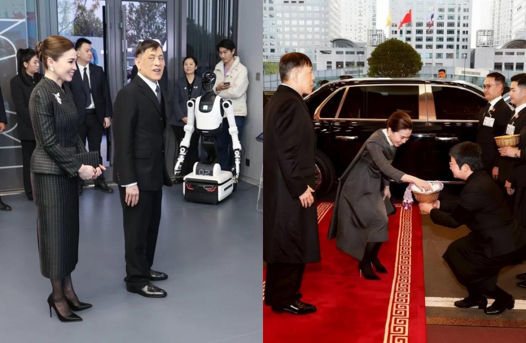 在AI機器人中心又換條紋絲綢套裝,黑銀相間很有高級感,泰王都忍不住偷瞄;第一天入住酒店則穿灰色千鳥格鬥篷大衣,溫度風度兼得。