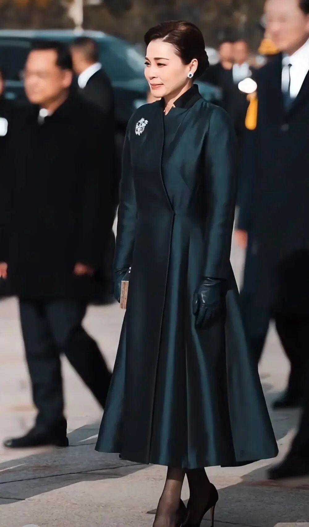 參觀航天中心又換了深灰色套裝,不對稱斗篷+豎條暗紋讓人眼前一亮,鑽石月牙胸針、耳環還和銀色手包呼應,設計感十足。