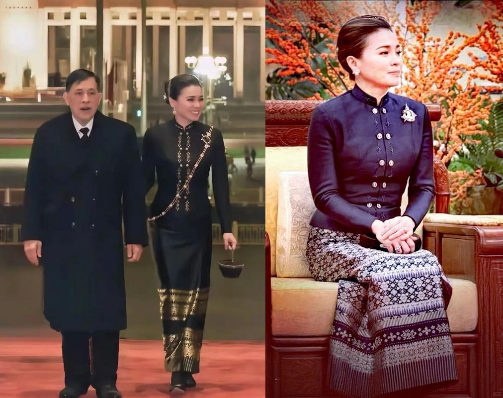 最隆重屬國宴上的泰式改良宮裝,由泰國本土品牌ATELIER PICHITA定製,搭配王太后最愛的Yan Lipao藤編包,路透社點贊“完美平衡了傳統與現代”,中式盤扣+立領巧思滿滿,大顯外交智慧。尤其是這套黑金配色,着實驚豔了~