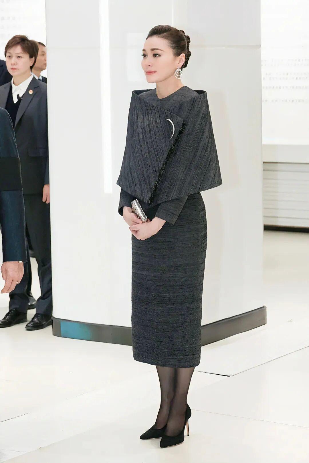 參觀教育中心時穿黑色連衣裙,A字剪裁優雅大方,胸前黑灰漸變綬帶打破沉悶,腳踩恨天高彰顯氣場。