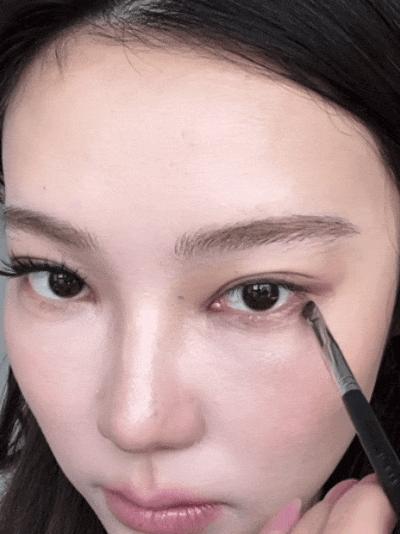 重點可以放在眼尾下至的暈染和前半段臥蠶,下睫毛稍微拉長增加神采,而上睫毛控制在不超過雙眼皮寬度,配合平拉的眼線。