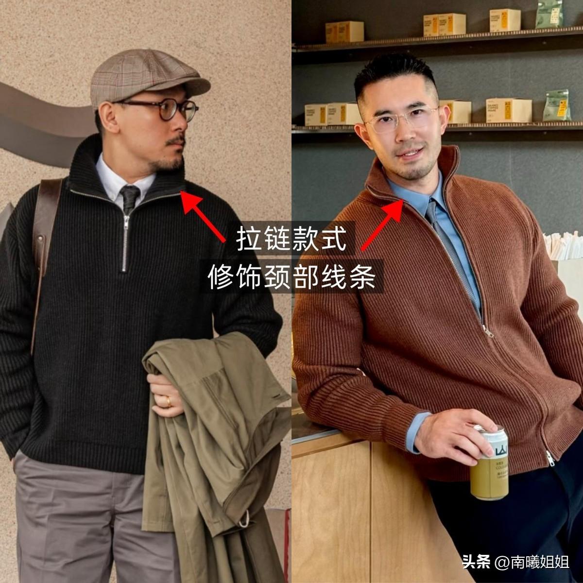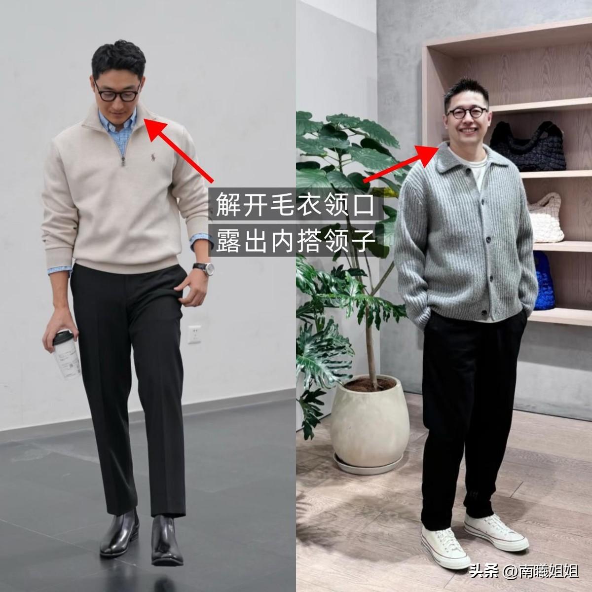 兩件疊穿的時候,建議可以把毛衣的領子解開穿,尤其是拉鍊翻領毛衣和Polo領毛衣,領子敞開衫之後,它能夠讓頸部線條更修長,從而營造出隨性又自在的效果。