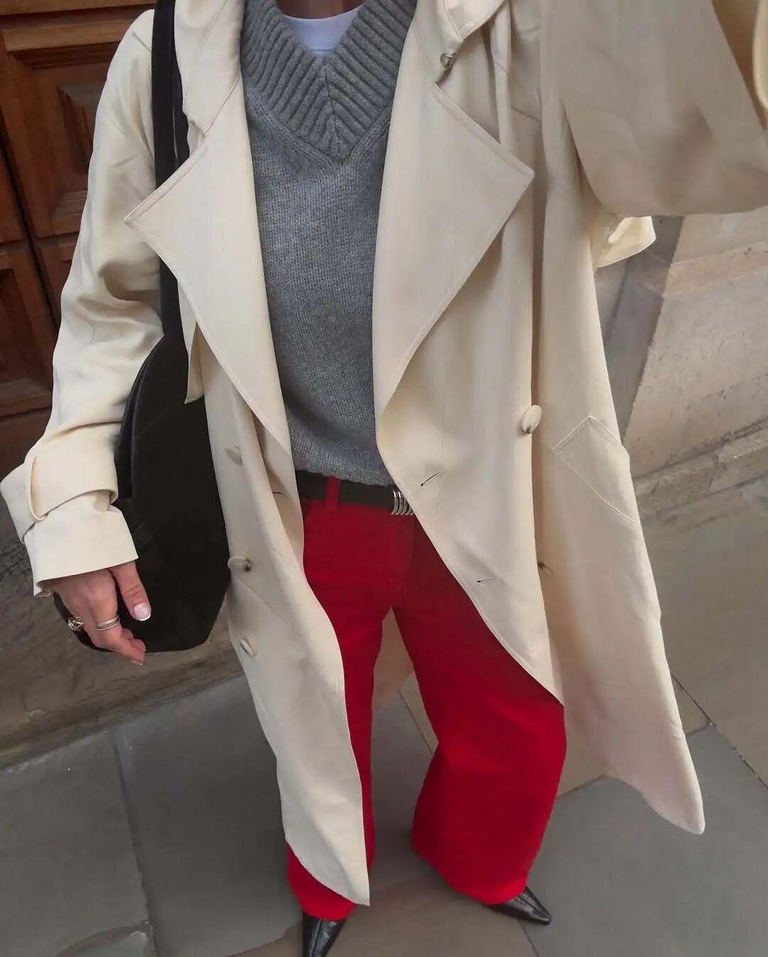 灰色爲打底疊加了一個冷靜buff,撞色搭配不會顯得浮誇。搭配正紅色的褲子,熱烈中透着沉穩不刺眼;搭配藍色外套,清爽中帶着內斂不跳脫。不過撞色不是隨便亂搭,關鍵是主次分明,就像生活裏的一張一弛,沉穩是底色,張揚則是調味劑。