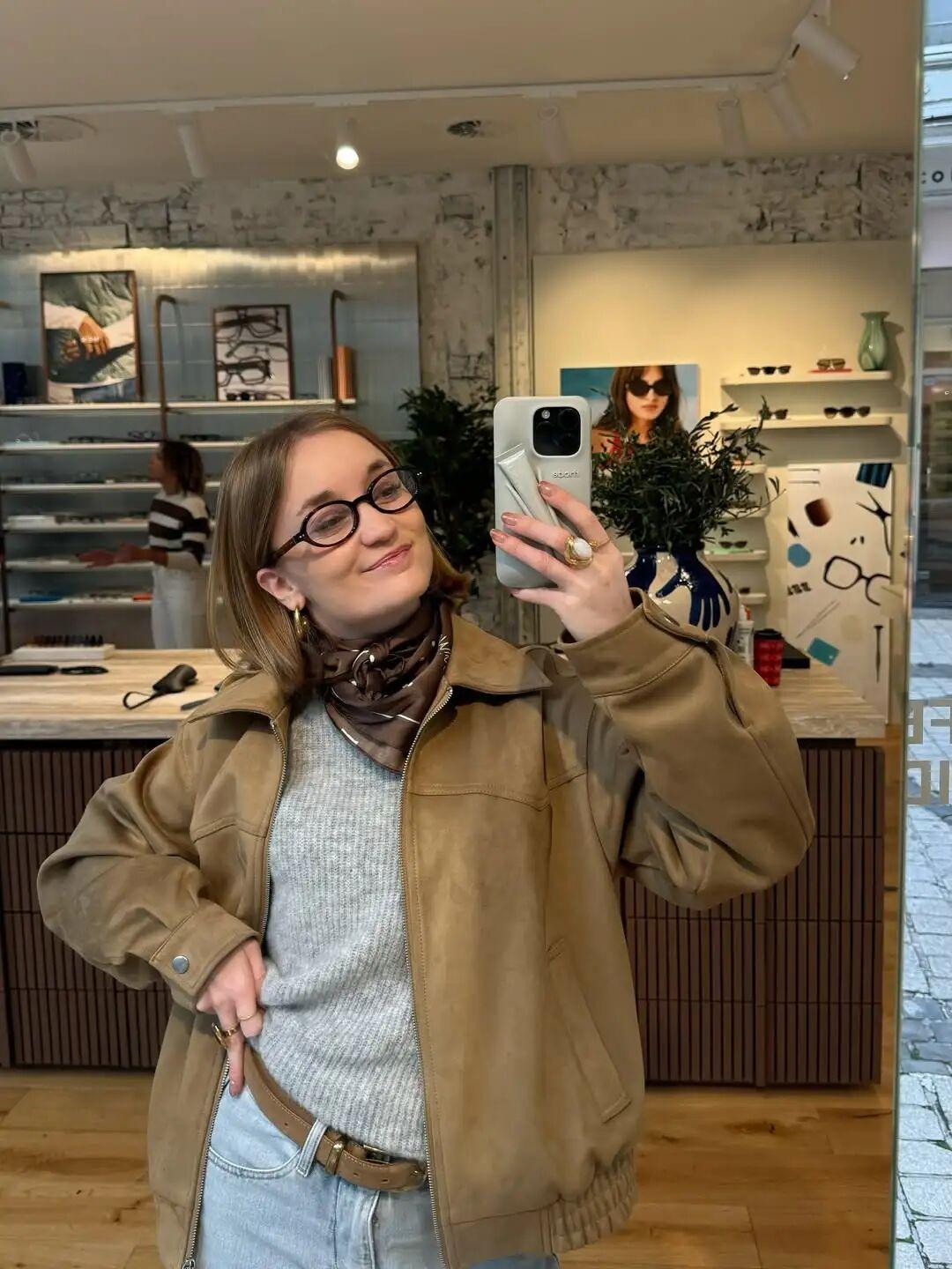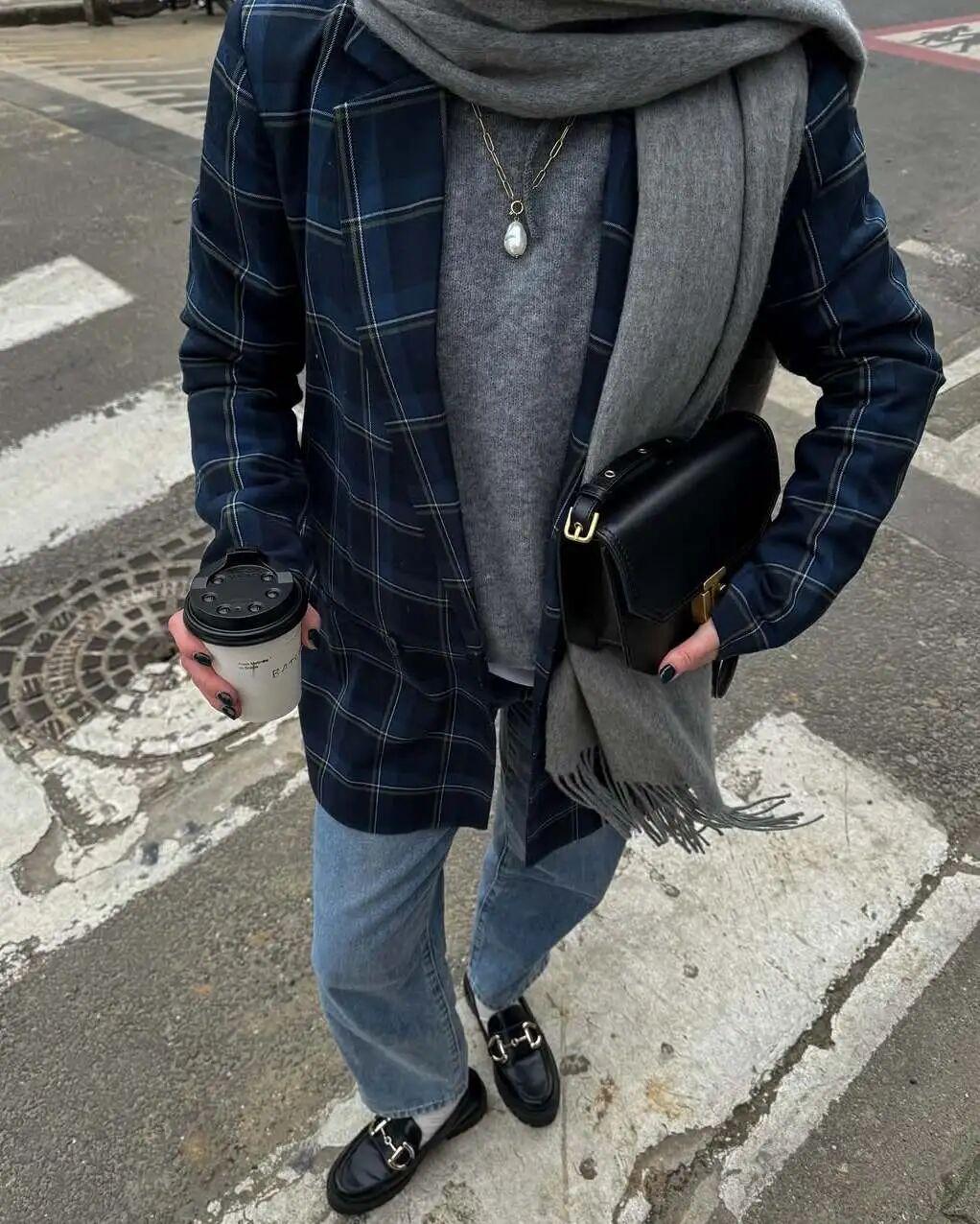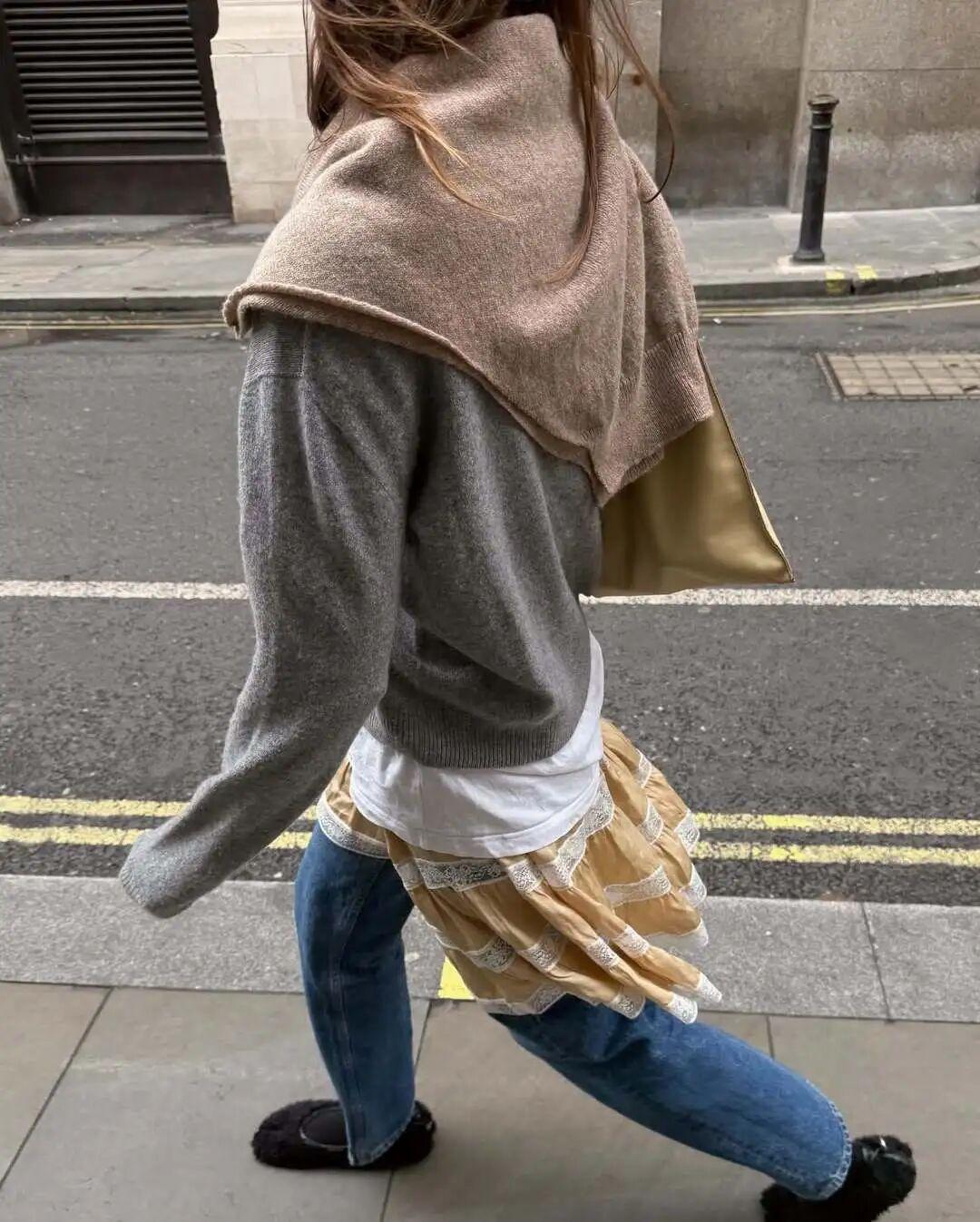 圍巾是灰色打底衫的溫暖cp,同色系的圍巾能強化整體的剋制美感,深淺灰度交織出低調層次;大地色系的圍巾則添了份自然暖意,柔軟的面料裹住脖頸,既抵禦了寒意,又讓造型多了份慵懶隨性。