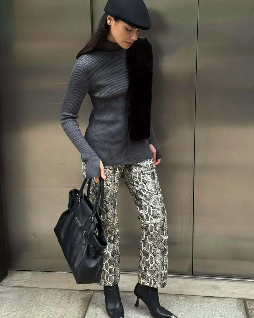 高領灰色細針織衫作爲打底是氣質型選手,細膩的針織紋理貼膚不扎人,領口到下巴下方一釐米的長度剛剛好,能自然修飾頸部線條,把臉襯得更小。而且在厚重的羽絨服、毛呢大衣裏,也不會顯得臃腫。