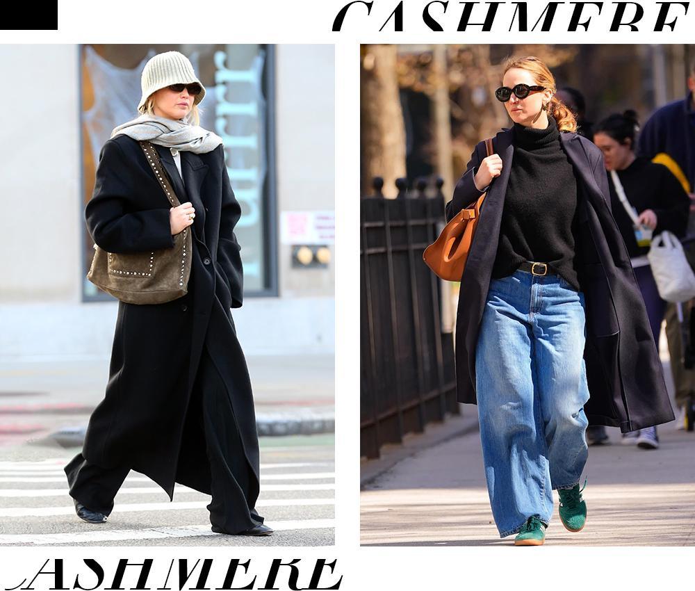 Jennifer Lawrence的羊絨單品選擇從平價到小衆奢牌,豐儉由人,但無一例外的是,外套看重版型,內搭看重質感。