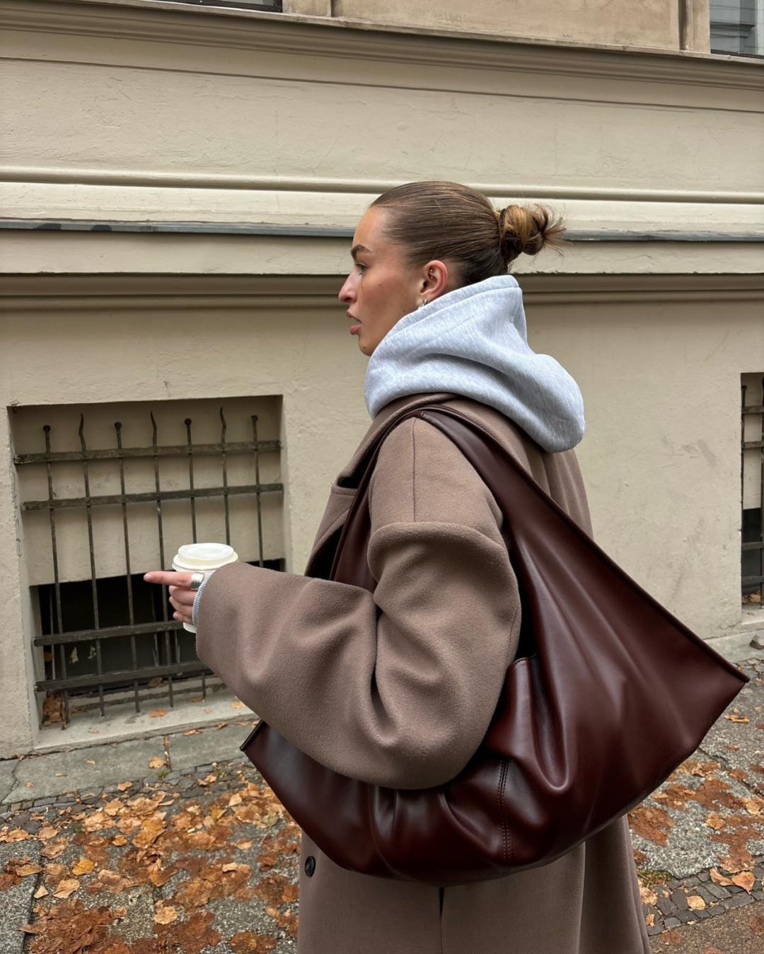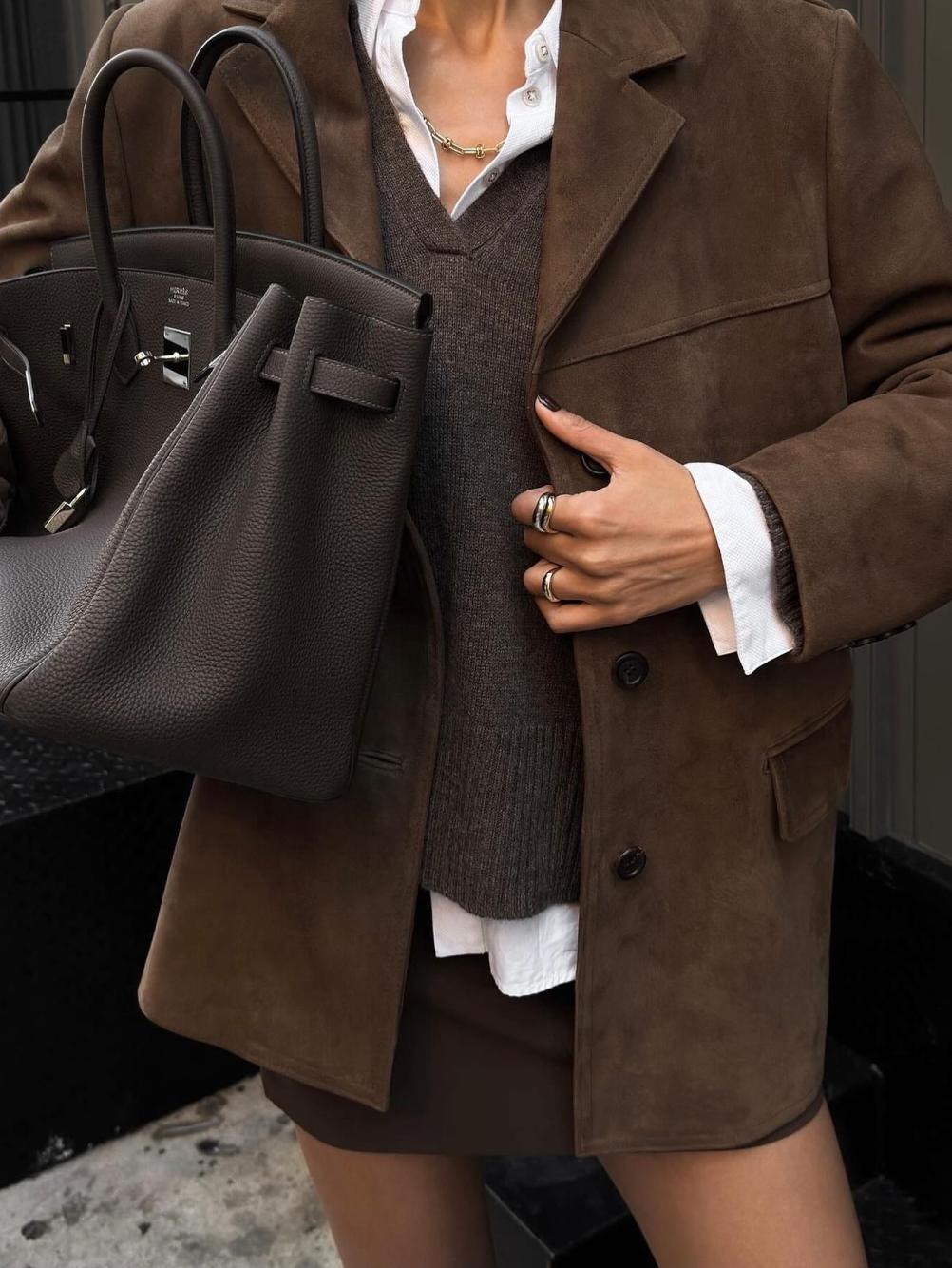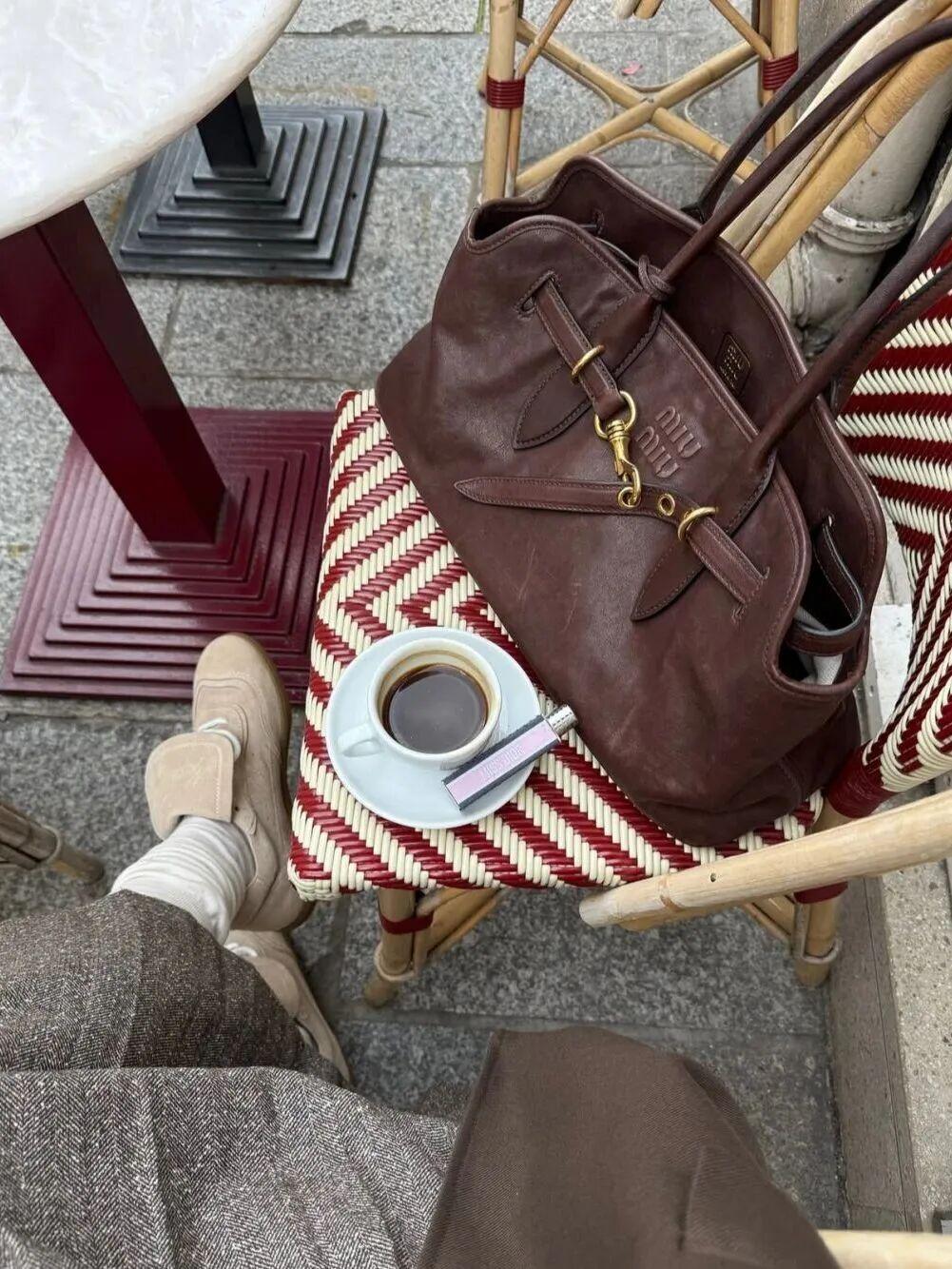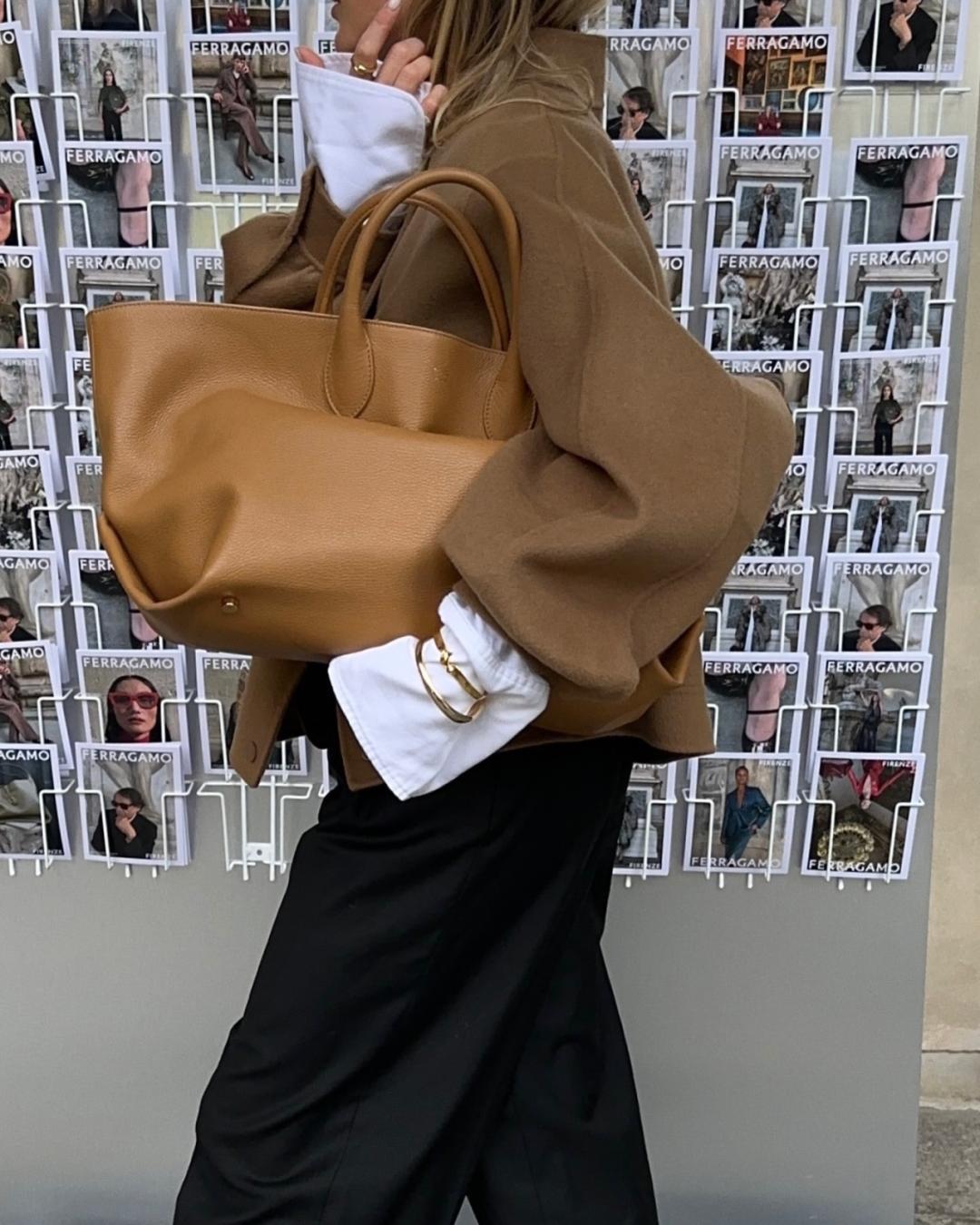 棕色系的包包,哪怕在極簡黑白灰造型中,也能立刻讓人感受到秋天的存在。