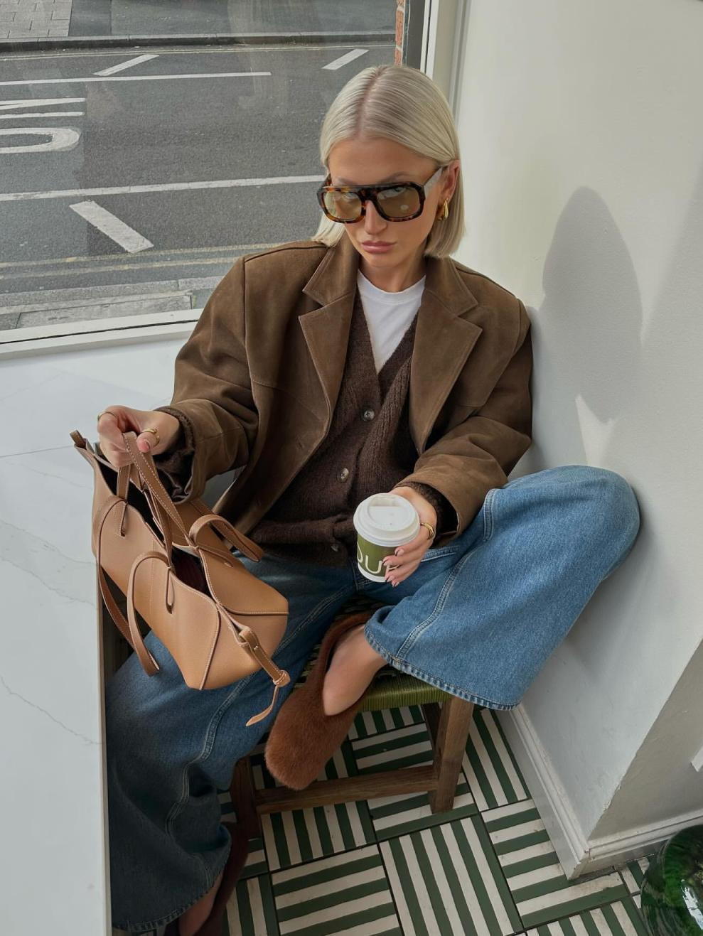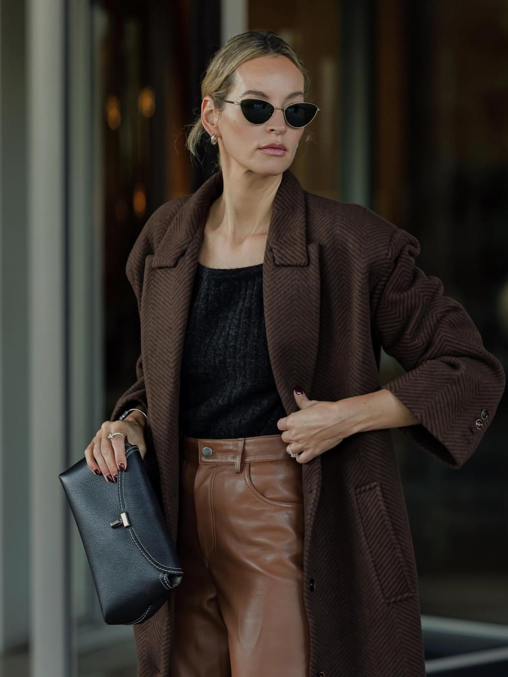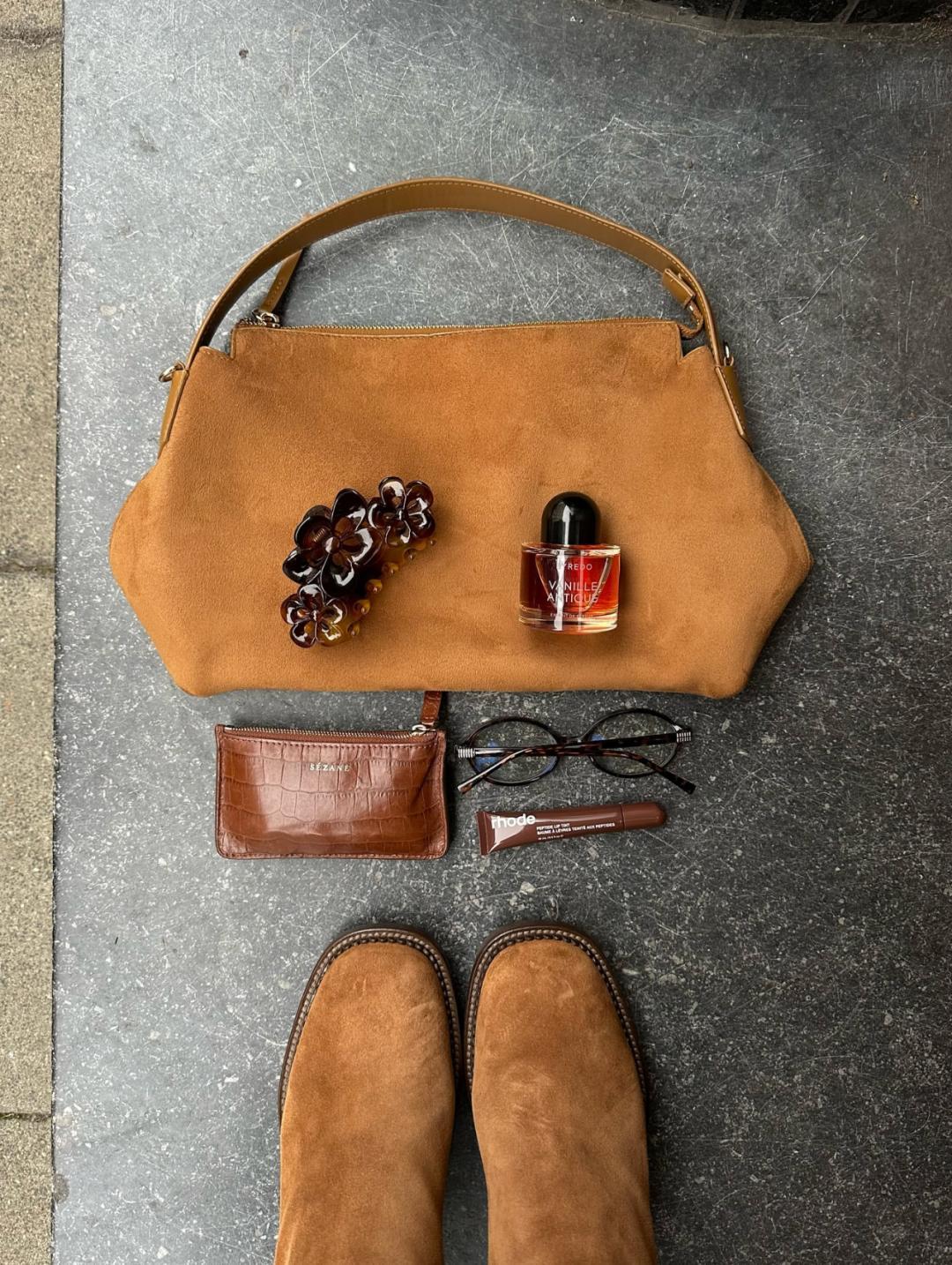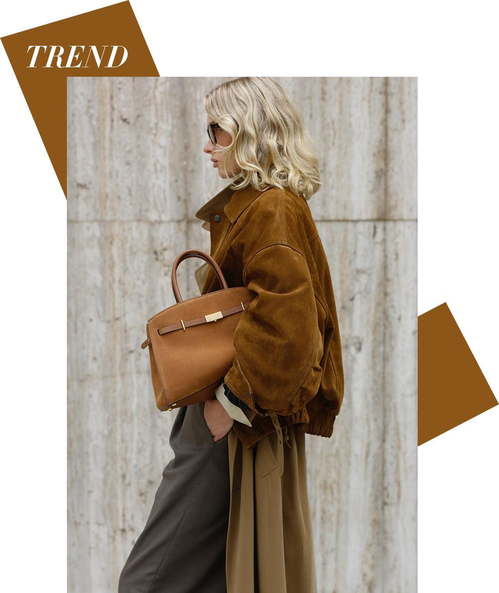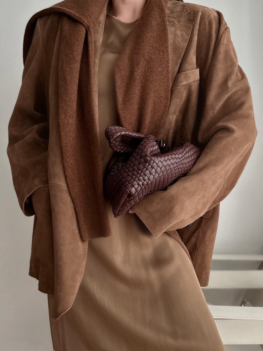 棕色系的包包,哪怕在極簡黑白灰造型中,也能立刻讓人感受到秋天的存在。