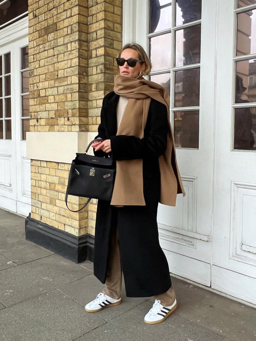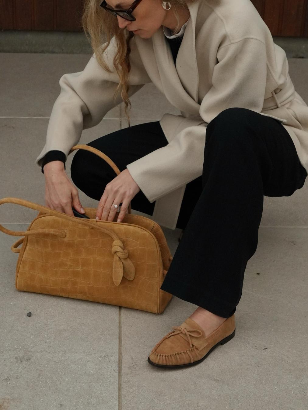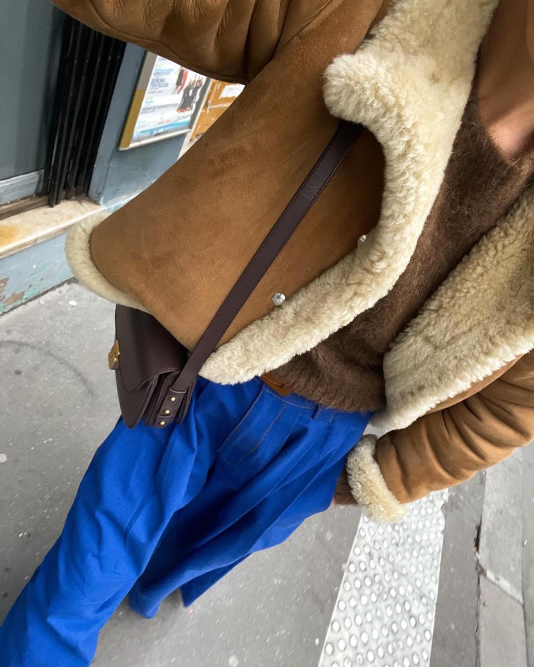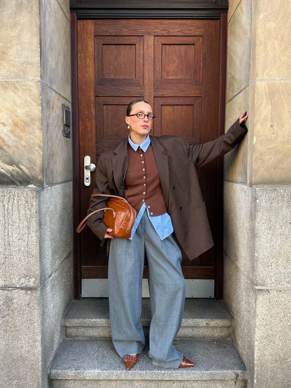 棕色系的包包,哪怕在極簡黑白灰造型中,也能立刻讓人感受到秋天的存在。