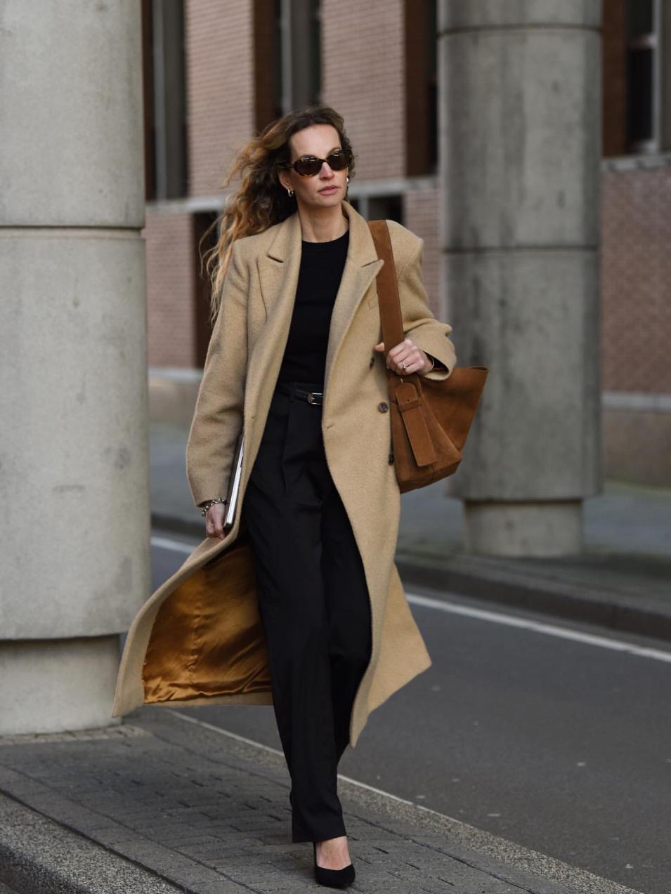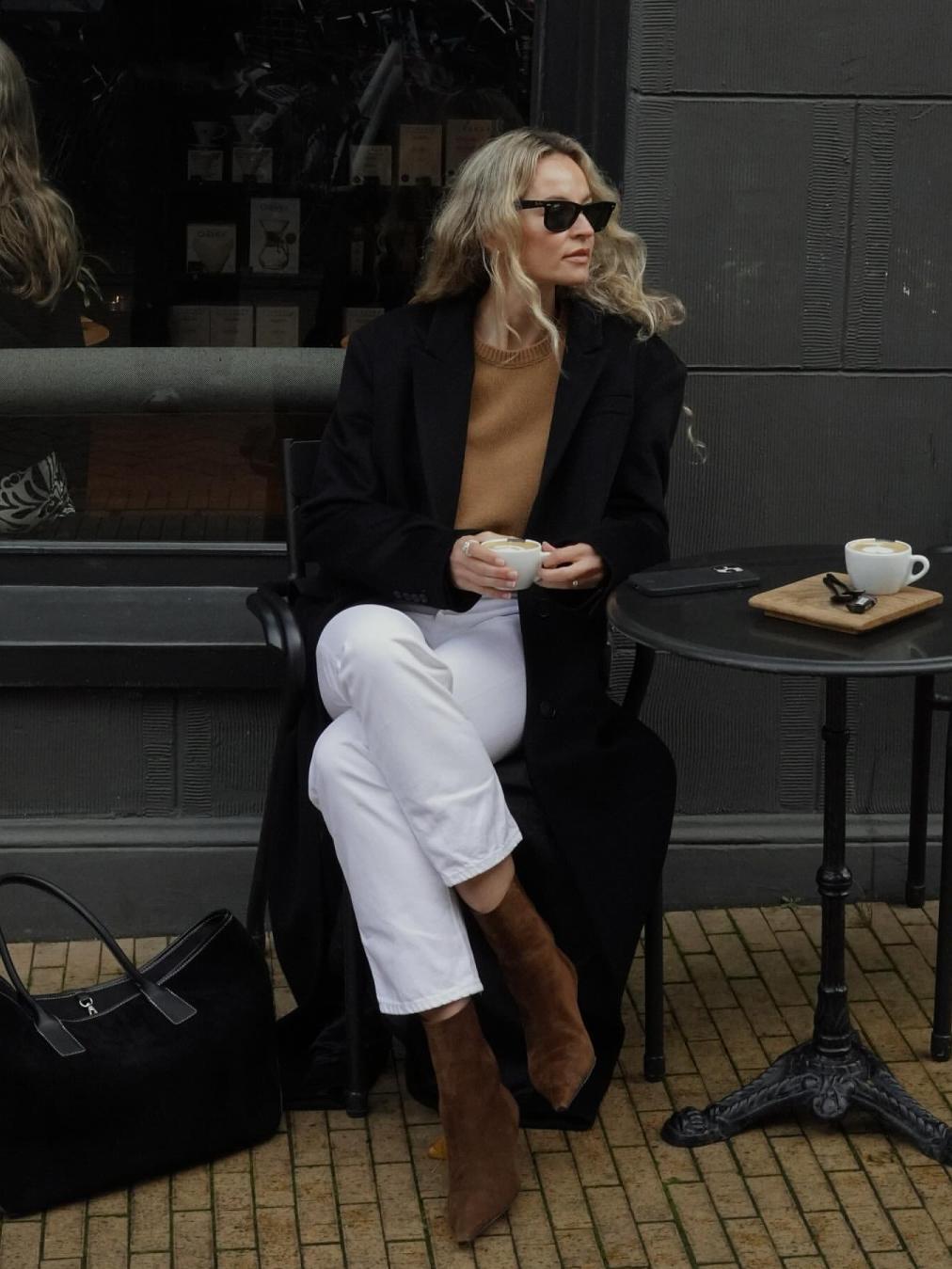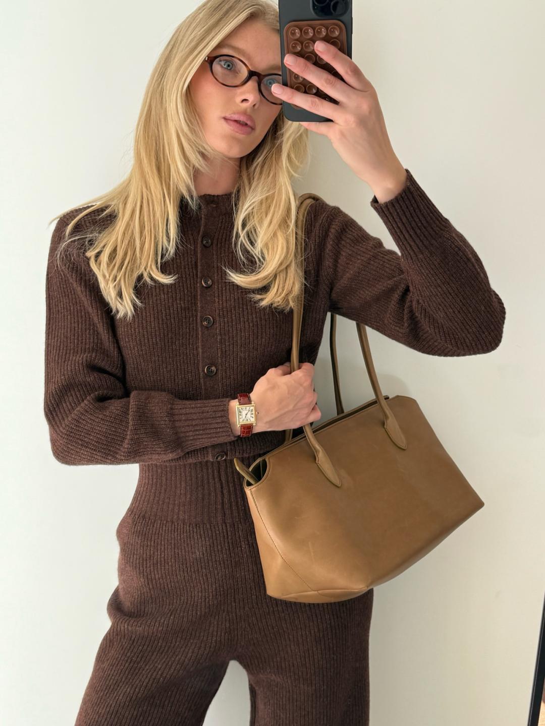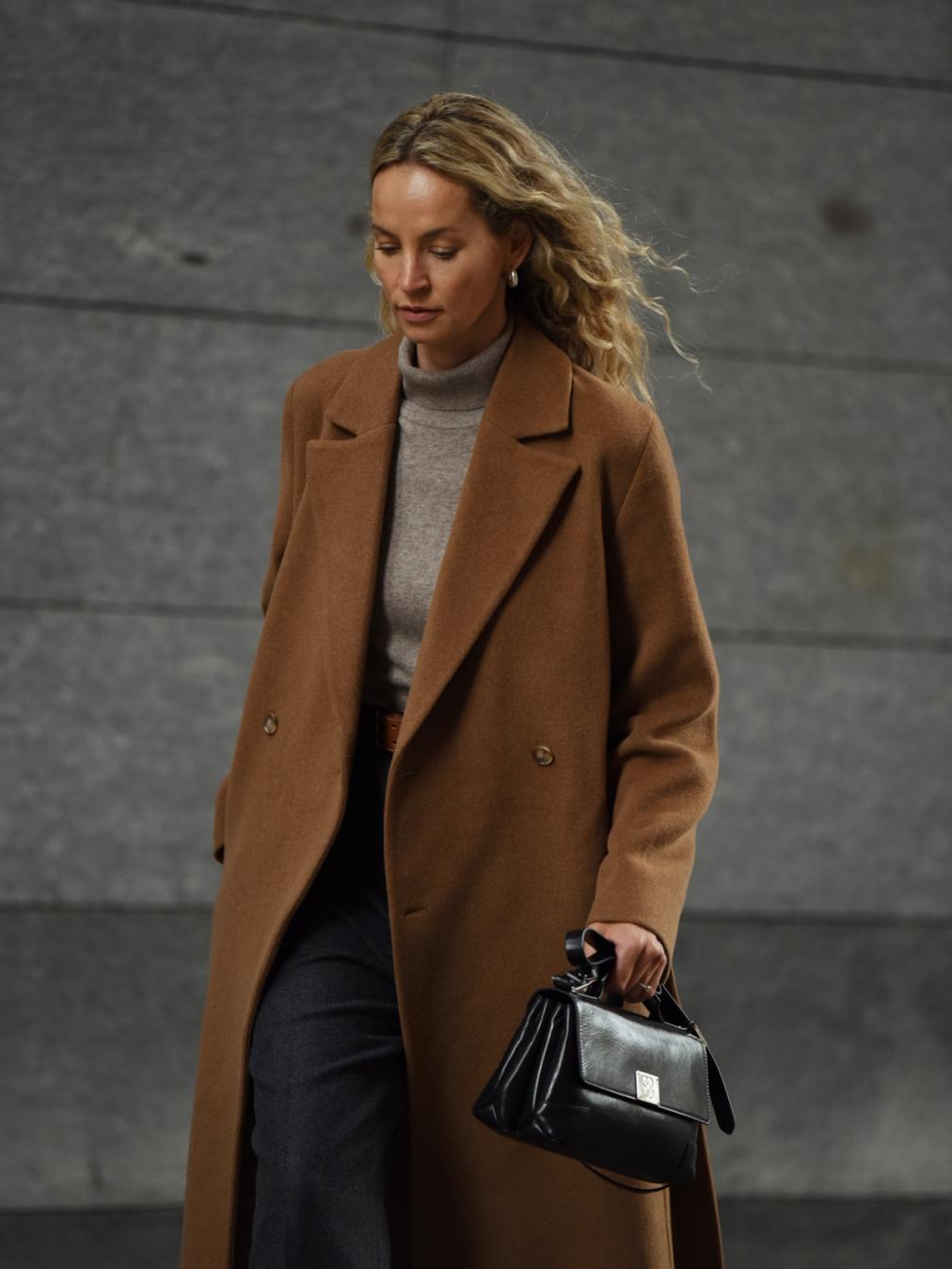 棕色系的包包,哪怕在極簡黑白灰造型中,也能立刻讓人感受到秋天的存在。