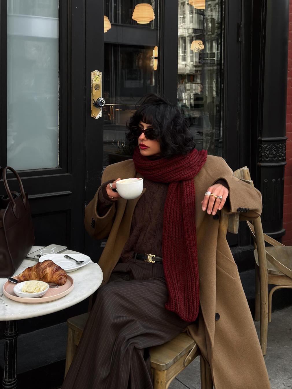 棕色系的圍巾,是最溫柔的“落葉信號”。在風中輕輕晃動的圍巾,像一片飄落的葉,既能搭配冷色系的外套中和氣質,也能與暖色調呼應成章。