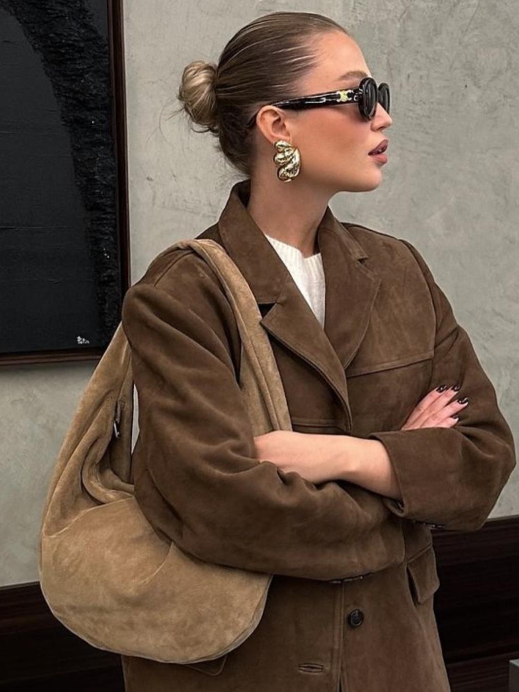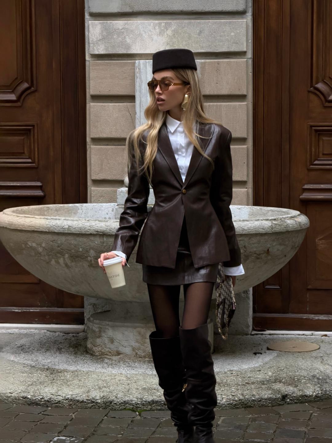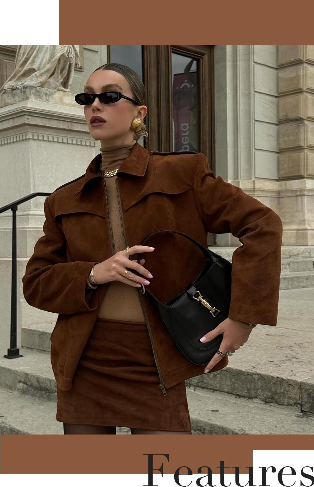 焦糖色絨面外套,內搭細膩的針織高領,下身配上皮質半裙或燈芯絨褲,材質間的反差讓人彷彿能聽見衣料摩擦的聲音。
