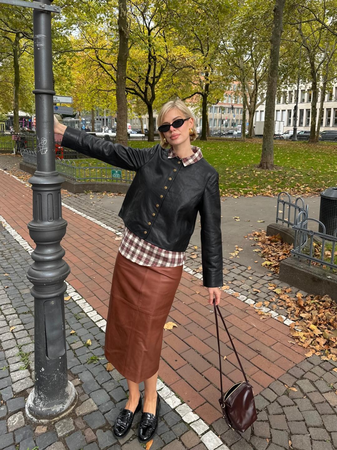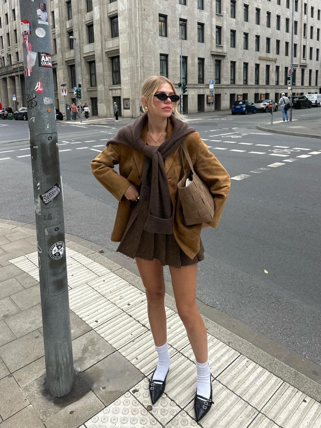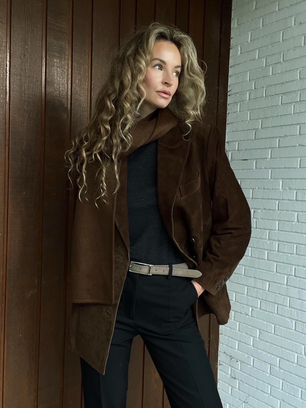 焦糖色絨面外套,內搭細膩的針織高領,下身配上皮質半裙或燈芯絨褲,材質間的反差讓人彷彿能聽見衣料摩擦的聲音。