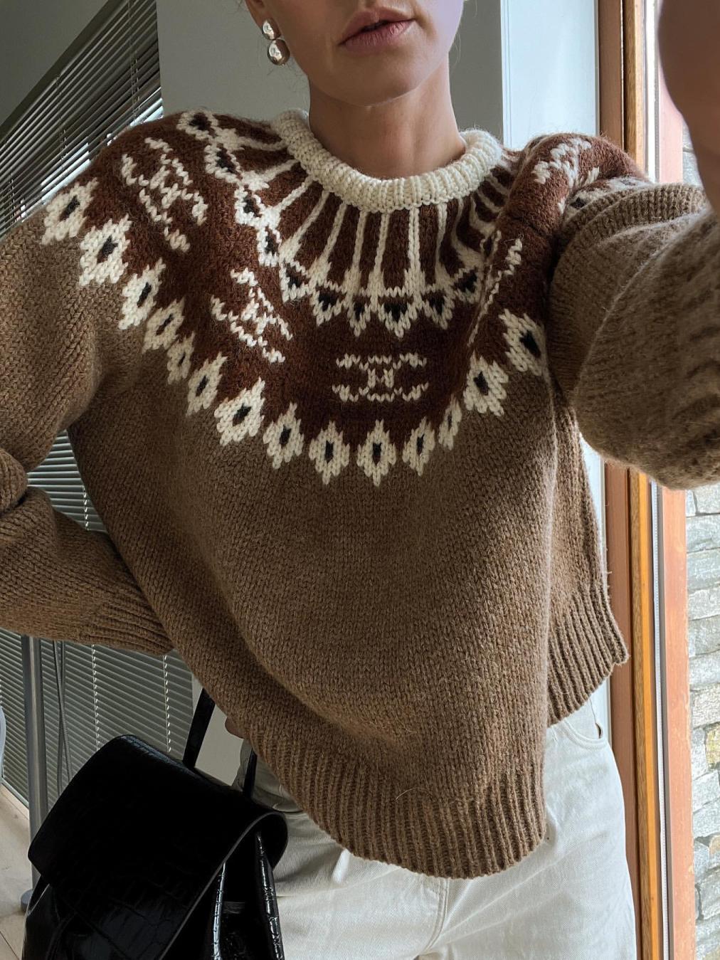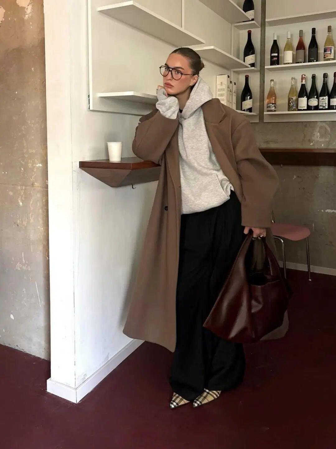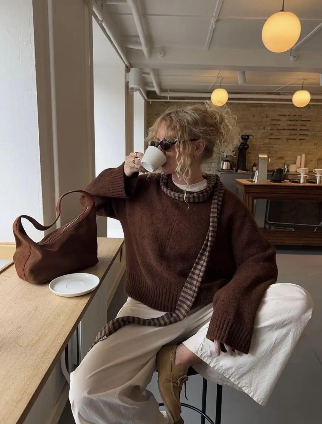 疊穿的核心,是深淺有度。同色系的穿搭並不意味着單調,而是讓色彩在不同明暗間對話。比如焦糖色針織衫外搭深咖大衣,下身配米棕闊腿褲,一整套落葉色系,卻因層次變化而生出空間感。