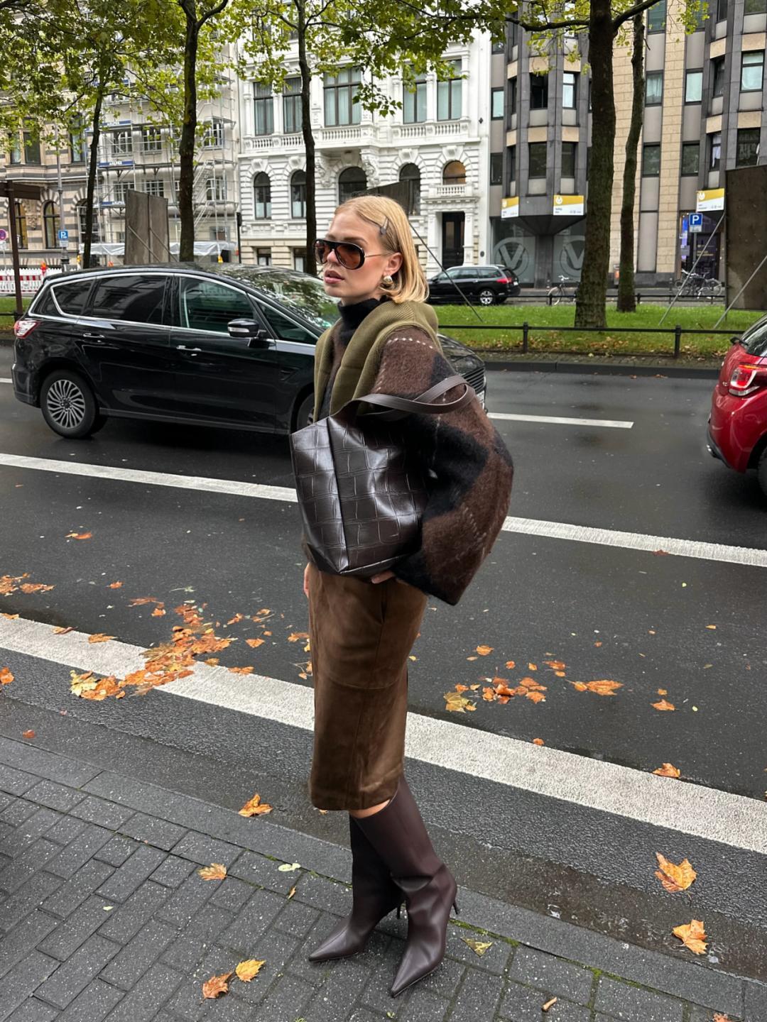 不同材質的疊穿更能體現秋日氛圍感。絨面與皮革、羊毛與針織的搭配,讓整個造型擁有觸感的豐富性。