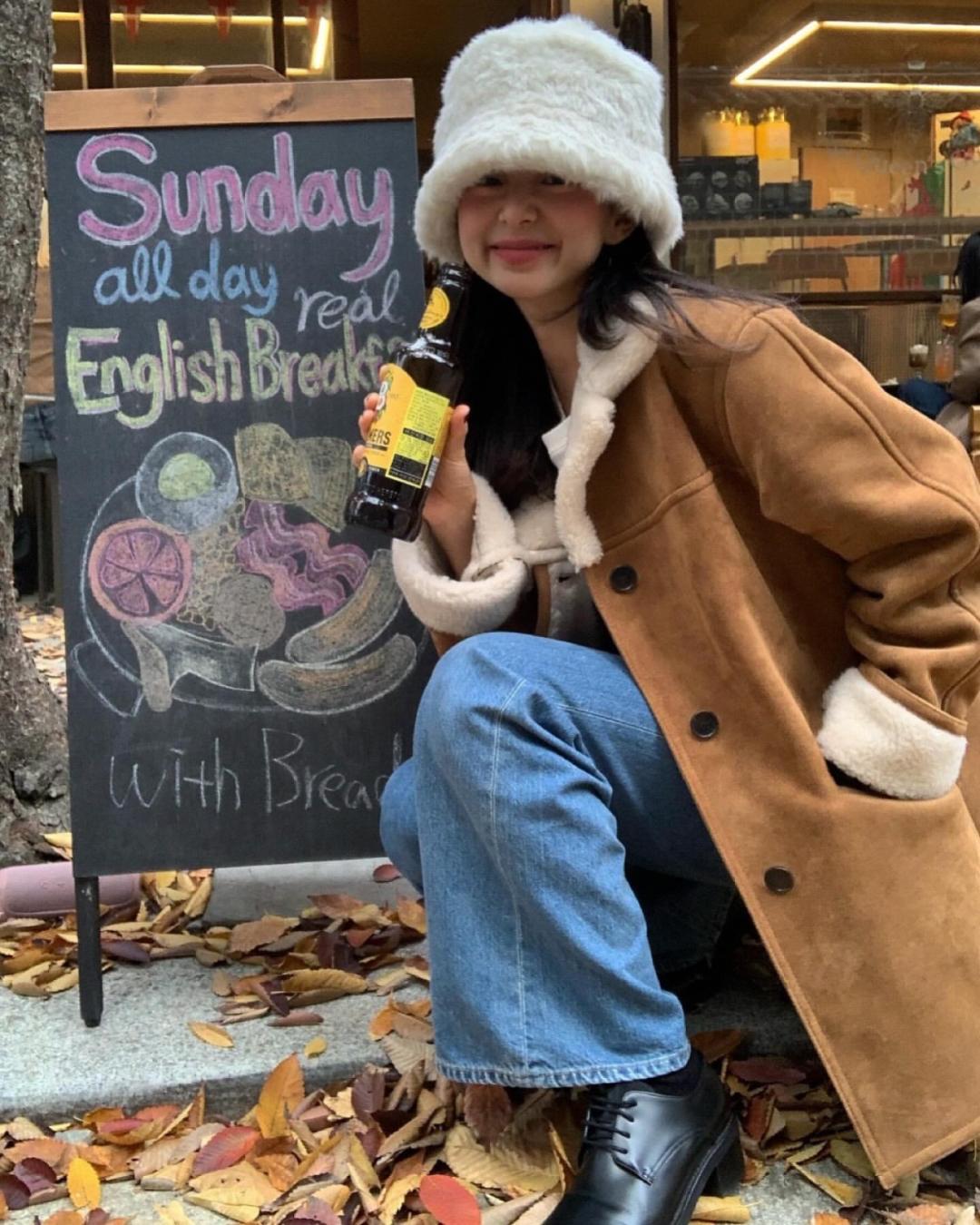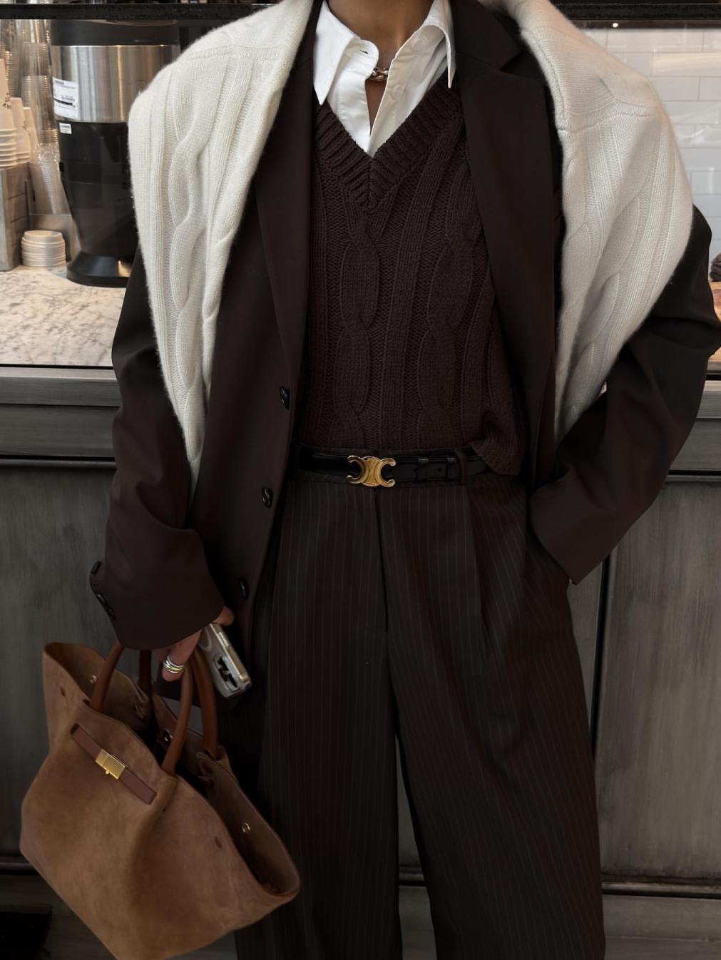 以米棕色內搭爲底,疊穿駝色馬甲,再披上深褐色呢料外套,色彩與質感層層遞進,宛如秋風吹拂林間的漸變。