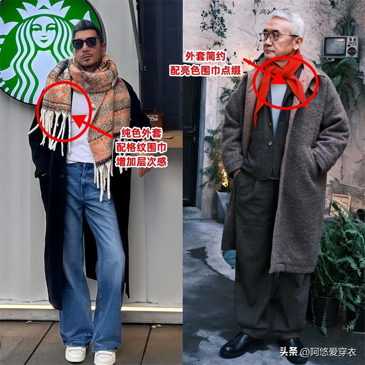 除了帽子,在冬季還有其他配飾值得我們入手,比如圍巾就是有品位的中年男人衣櫥必備的配飾,穿純色大衣、羽絨服的時候,脖子總是會有點兒空空的,這個時候系一條格紋圍巾、亮色圍巾,可以立馬提亮造型,豐富我們的穿搭,保暖的同時增加了時髦感,這不比戴老年帽好多了嗎?