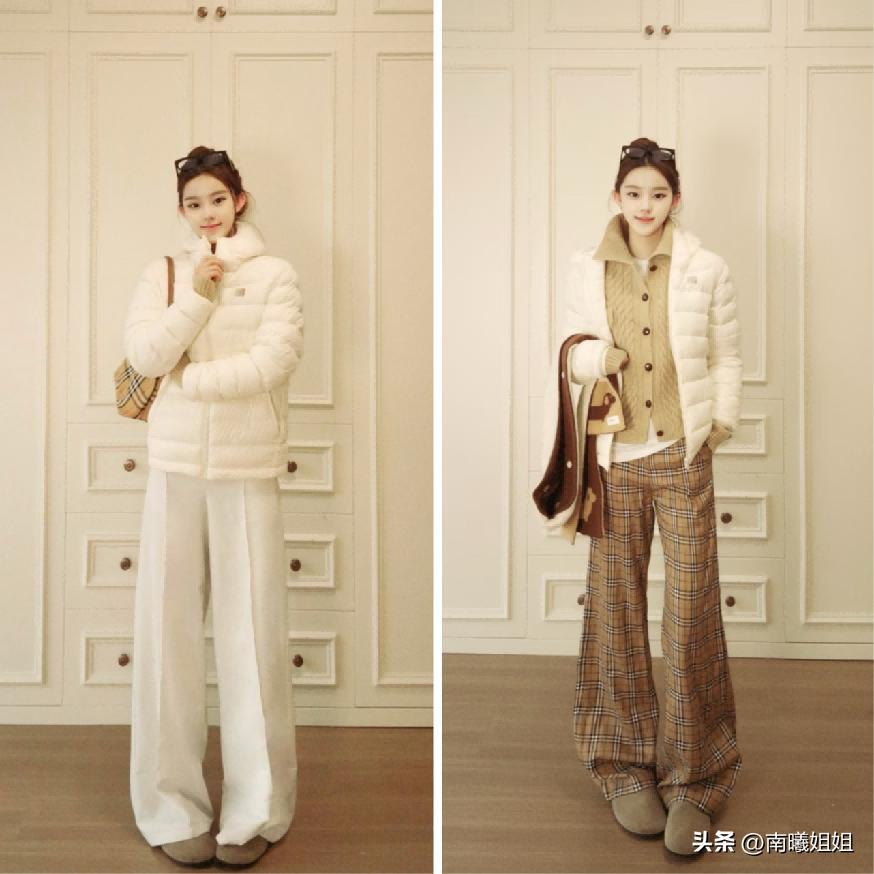 當然啦,排骨羽絨服它是屬於比較修身的上半身單品,所以在運用起來的時候,對於梨形身材以及腿型比較粗壯的女性來說,可以組合搭配闊腿褲或者是百褶裙這一類,上緊下松的對比才是百搭不挑人而且很顯瘦的存在。