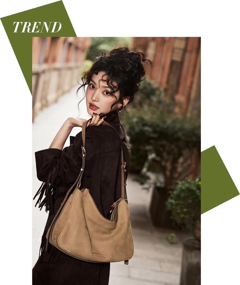 其實穿好麂皮絨也很容易,它的面料比較特別,本身足夠有風格,所以搭配一些簡約的基礎款就能很好看。麂皮材質的束口包型,在簡潔利落中透出不經意的隨性,能讓整體造型既充滿活力又不失復古韻味。