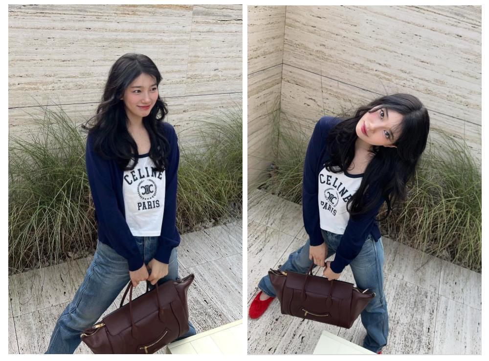 從“路人感”到“造型感”的躍升,有時只需要一隻結構感包袋就能解決。寬鬆上衣與簡約的下裝,秀智這身搭配看似普通,卻被手中那隻立體感十足的包袋徹底激活。包袋兩側“翅膀”的設計搶眼卻不浮誇,以建築般的結構線條打破平淡,讓基礎款穿搭告別乏味。