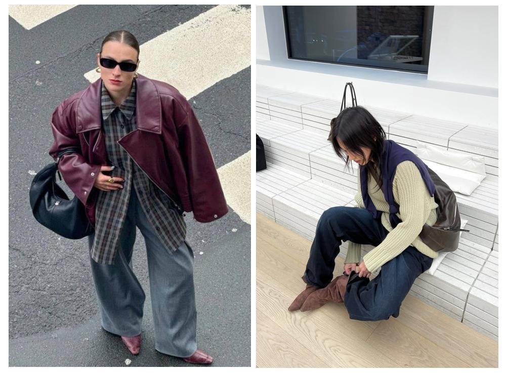 結構感十足的包袋,雖外觀硬朗,卻可通過腋下夾持的背法,演繹出別樣的時髦感。尤其是在搭配oversized上衣與闊腿下裝時,包袋緊隨身體形態自然呈現,不僅不顯累贅,反而與寬鬆的服裝線條共同勾勒出動態的鬆弛感。