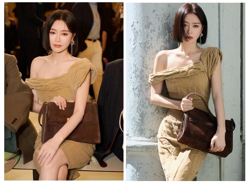 通過材質本身的光澤與肌理強調包袋的建築美感,已然成爲新復古風潮中最具辨識度的時尚符號。章若楠這身麂皮質感造型,以本身的原始氣息演繹出野性感。上身包袋同樣選用麂皮面料,與服裝形成深淺對比,既強化了色彩層次,又賦予整體一種復古做舊的敘事感。