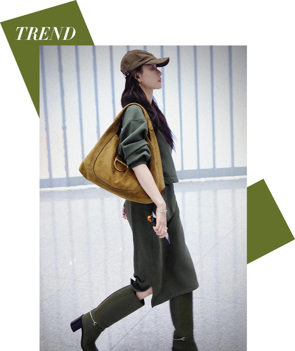 標誌性的硬挺包身,搭配幾何感扣件與提肩兩用設計,結構感包袋完美平衡了實用性與美學的張力。倪妮以一身墨綠色運動感套裝,完美詮釋了復古與現代的融合。上衣與半裙的順色搭配簡約高級,而單肩背上的這隻淺黃色大號腋下包,醒目的金色包扣成爲視覺焦點,寬肩帶在提供舒適揹負感的同時更添時髦氣息。