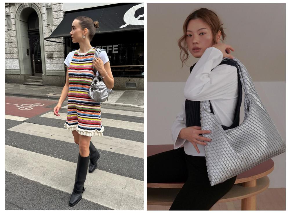 銀色包袋獨特的光澤,將設計結構清晰勾勒,無論是機車款的凌厲線條,還是編織紋理的細膩層次,金屬感不僅讓造型有一種現代的清冷,更提升整體氣質,而且不顯沉悶。
