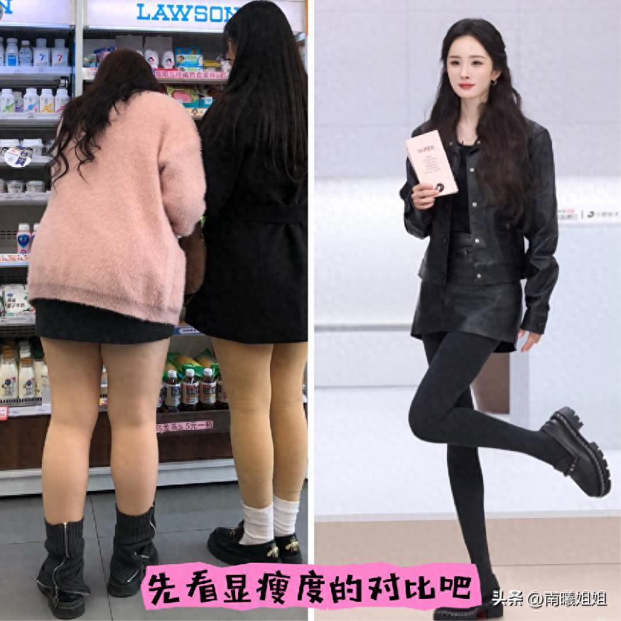 而且光腿神器它本身是屬於肉色的設計,所以在搭配起來的時候就很難呈現的,比較具有時髦感。在今年的冬季當中,不妨可以將你的光腿神器都換成時髦又顯腿細,而且它本身又很有個性的黑絲。不管是色系還是它的穿搭效果,其實都是能夠讓我們的腿型狀態變得更加纖細,以及整體的穿搭走向都更加顯時髦的,看以上這一組對比圖就襯托的非常明顯。