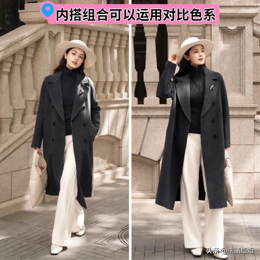 大衣進行搭配的時候,它本身的穩定性以及對於我們身材顯瘦,又或者是線條走向的流暢感修飾就很明顯了,所以我們的內搭組合就需要多花一點心思了,對於小個子的女性而言,其實她們往往都會非常喜歡運用長款的下半身單品搭配,並且結合短款的上衣,利用版型的特徵而將標準的比例狀態給襯托出來。