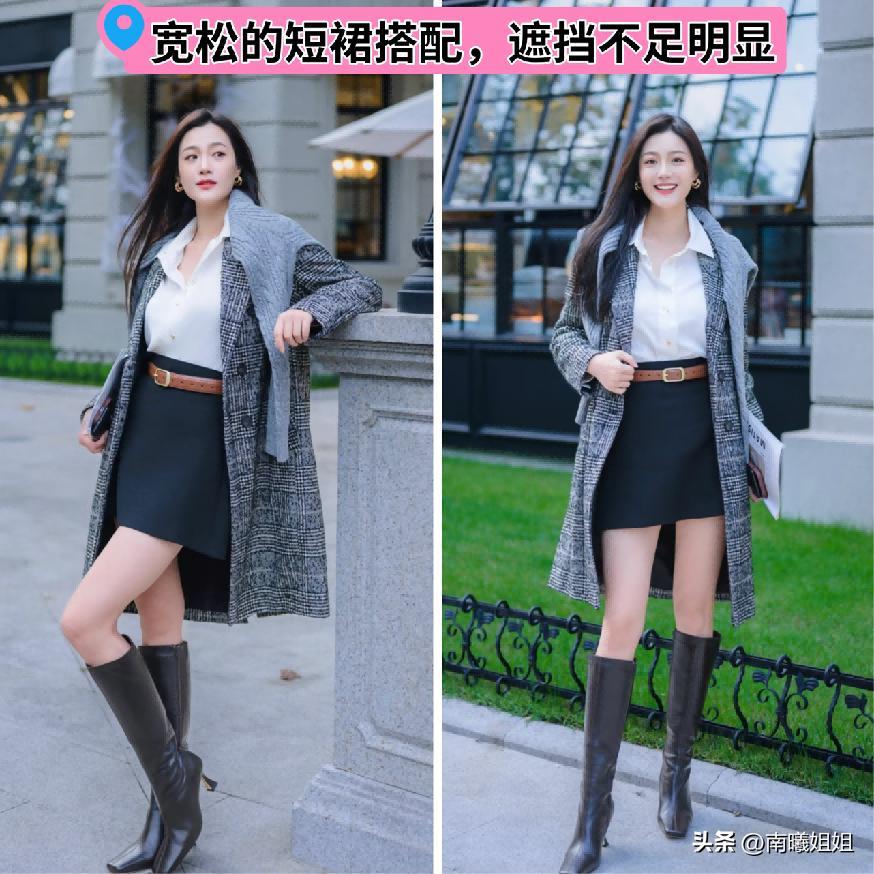 大衣進行疊穿我們可以選擇寬鬆的短裙,這對於臀胯部位比較粗壯的女性來說,是非常具有優勢的存在,搭配起來可以很好的優化住這個部位的線條不足,下半部分的長筒靴一定是屬於直筒型的設計,並且暗色調爲主。