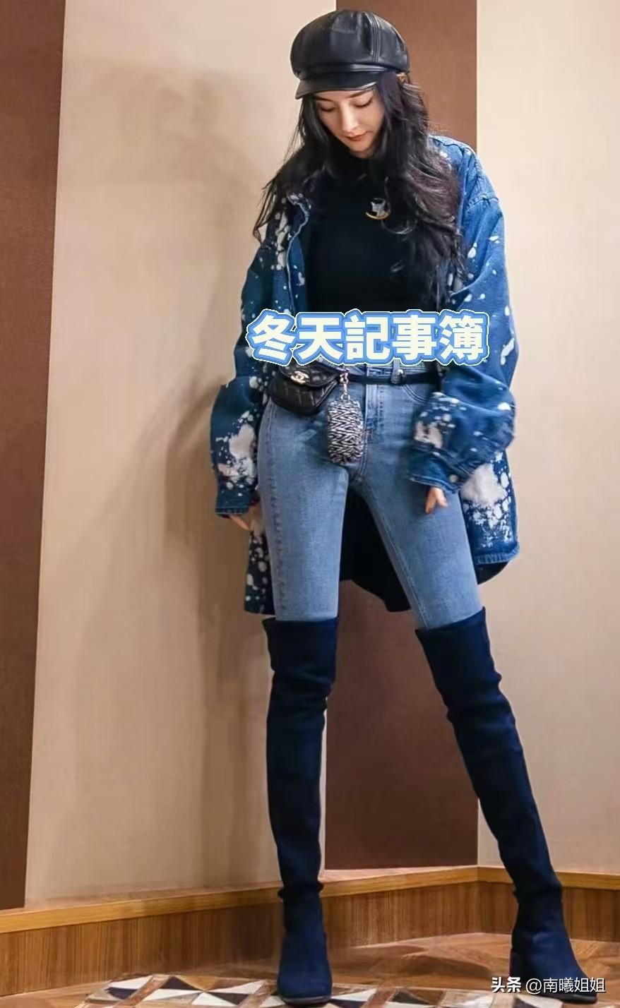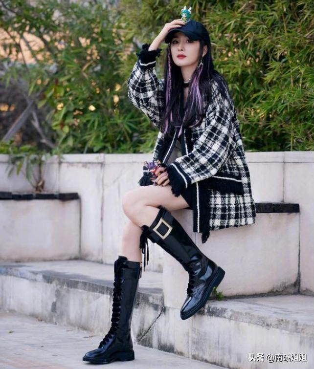 爲了展示自己逆天大長腿,楊冪有一個靴子萬能穿搭公式:下半身消失術——用黑色及膝靴搭配皮衣、西裝等6種造型,通過“下半身過夏”穿法視覺拉長腿型10cm。