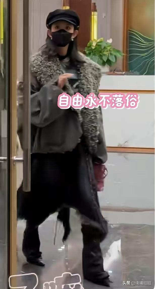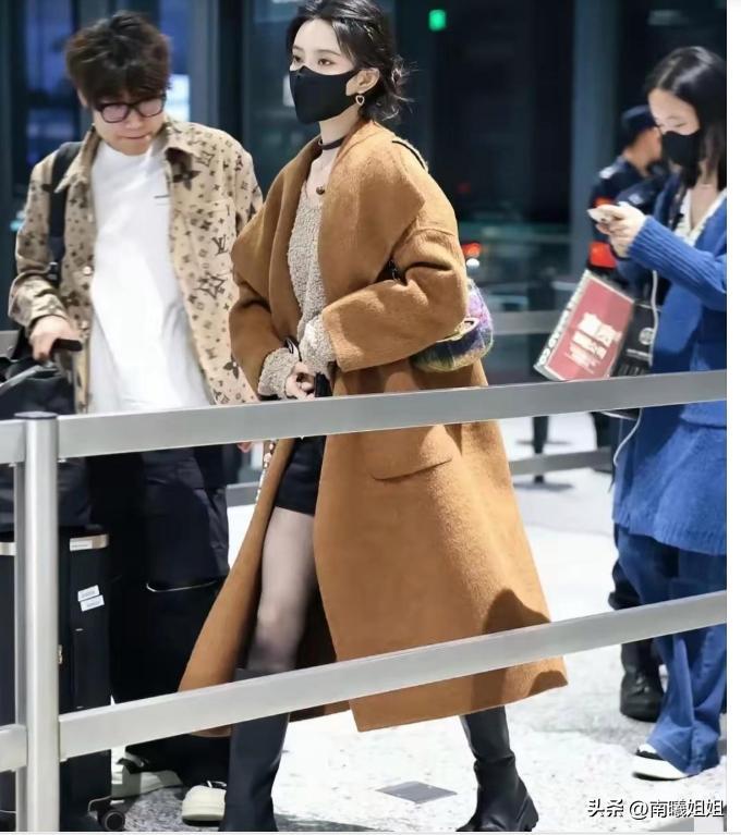 楊冪漫畫鉛筆腿在圈內很有名,所以在日常出街,經常能看到她穿黑色或棕色馬丁靴,搭配長款羽絨服、短裙或工裝褲,酷帥感非常強。
