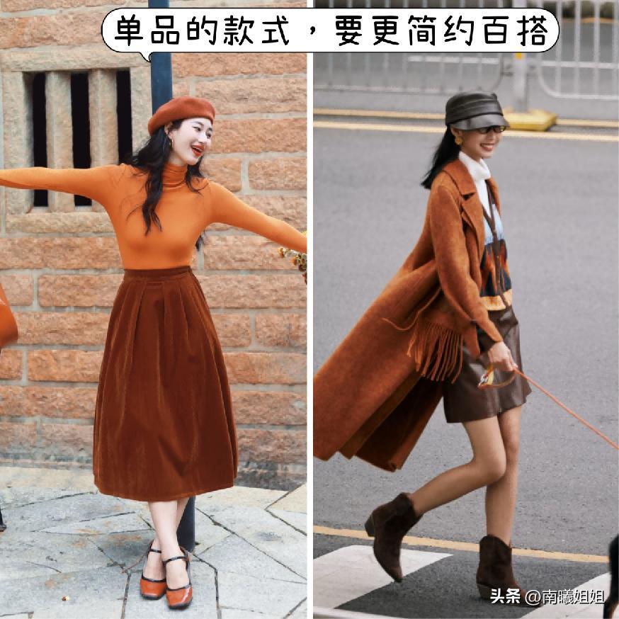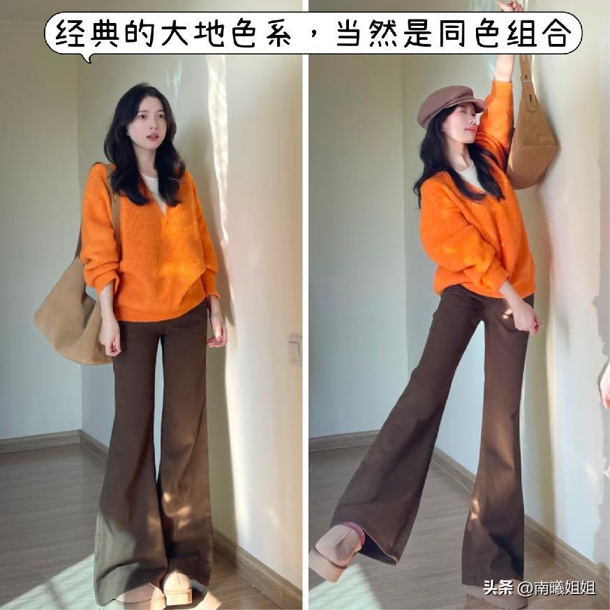 這一款色調的搭配它隸屬大地色系當中,所以在選擇進行運用的時候,經典的同色系在這個時候當然是要作爲首選的。更多的時候比較亮一些的顏色,更推薦大家可以運用於上半系列的搭配,又或者是作爲內搭。那麼像外搭或者是下半部分的單品,就可以選擇比其更加深色系列的基礎色系,像圖中這樣的搭配大家完全可以直接復刻,又能夠分割更加好看標準的比例狀態,整體的色系走向又穩定又亮眼。